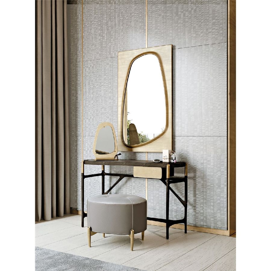 The Afrodite vanity mirror is a statement of refined elegance, crafted in light bronzed matt brass and complemented by a luxurious Calacatta Gold marble tray. This exquisite combination of materials highlights the mirror’s timeless beauty, making it a perfect addition to sophisticated interiors. Designed for both function and style, it brings a touch of opulence to dressing tables and vanity spaces.