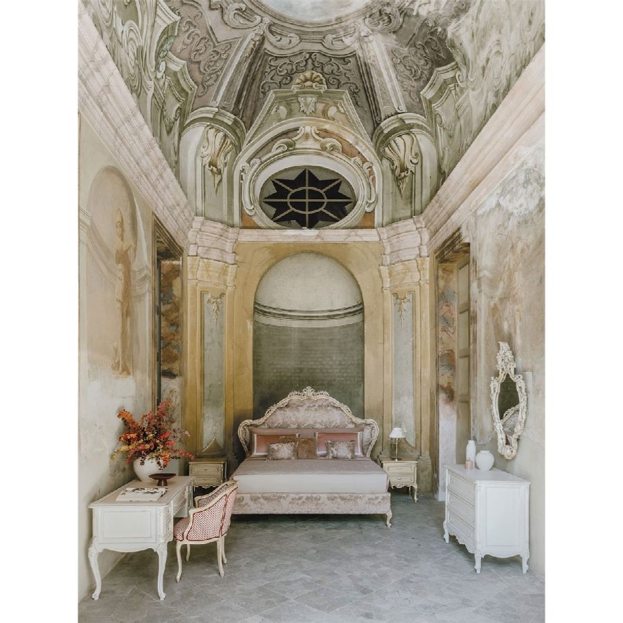 The bed stands as the undeniable centerpiece of the bedroom, embodying the pinnacle of luxury and sophistication. Its carved wooden headboard, upholstered in fabric, exudes timeless elegance. The wooden frame, paired with fabric-covered carved feet, further enhances its refined aesthetic. The OCH gold leaf finish, with its patinated white meringue tone (Oro Chic), adds a subtle yet striking touch of opulence, making it the ultimate expression of style and comfort.