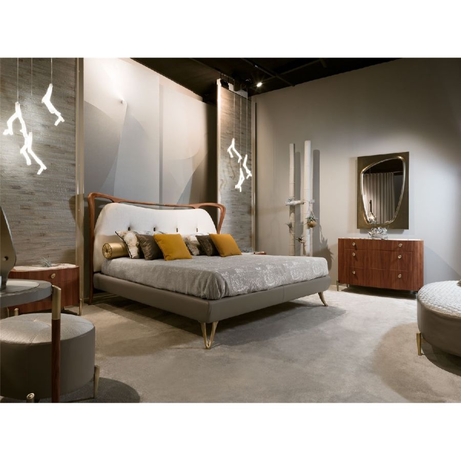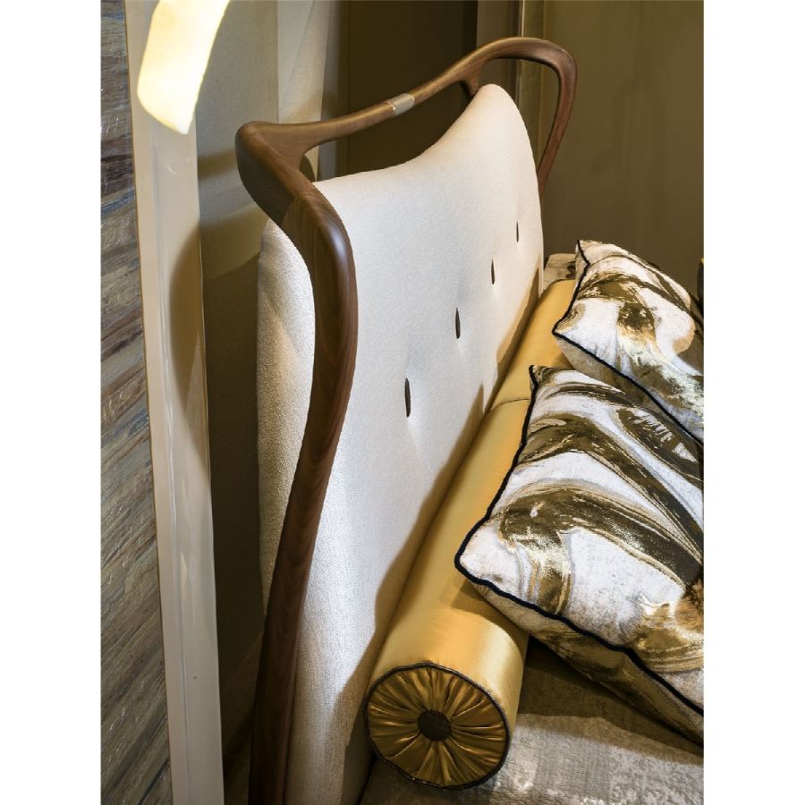 This bed exudes elegance with its solid Canaletto walnut frame in a matte finish. The headboard is upholstered with fabric, featuring intricate wooden buttons for added sophistication. The bedframe is encased in luxurious leather, providing a rich texture to the overall design. Sculptural feet in light bronzed matte brass elevate the piece, bringing an artistic and refined touch to your bedroom.