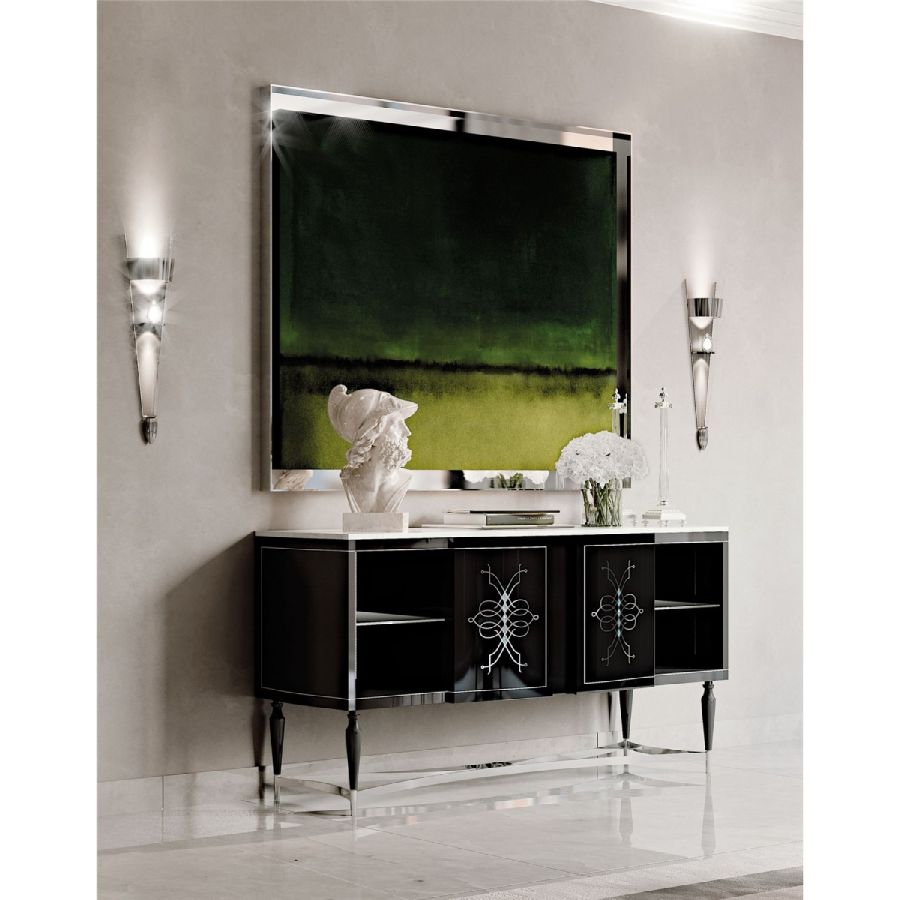 This striking sideboard features doors and sides in black-finished wood, elegantly inlaid with metal foil and mother-of-pearl details, adding a touch of refinement and luxury. The black lacquered structure contrasts beautifully with the chromed brass intersections, giving the piece a modern, sleek look. The Calacatta Gold marble top brings a natural, timeless elegance, enhancing the overall sophistication of the design. Designed by Ezio Bellotti, this sideboard embodies impeccable craftsmanship and exquisite materials, making it a statement piece that effortlessly elevates any interior.