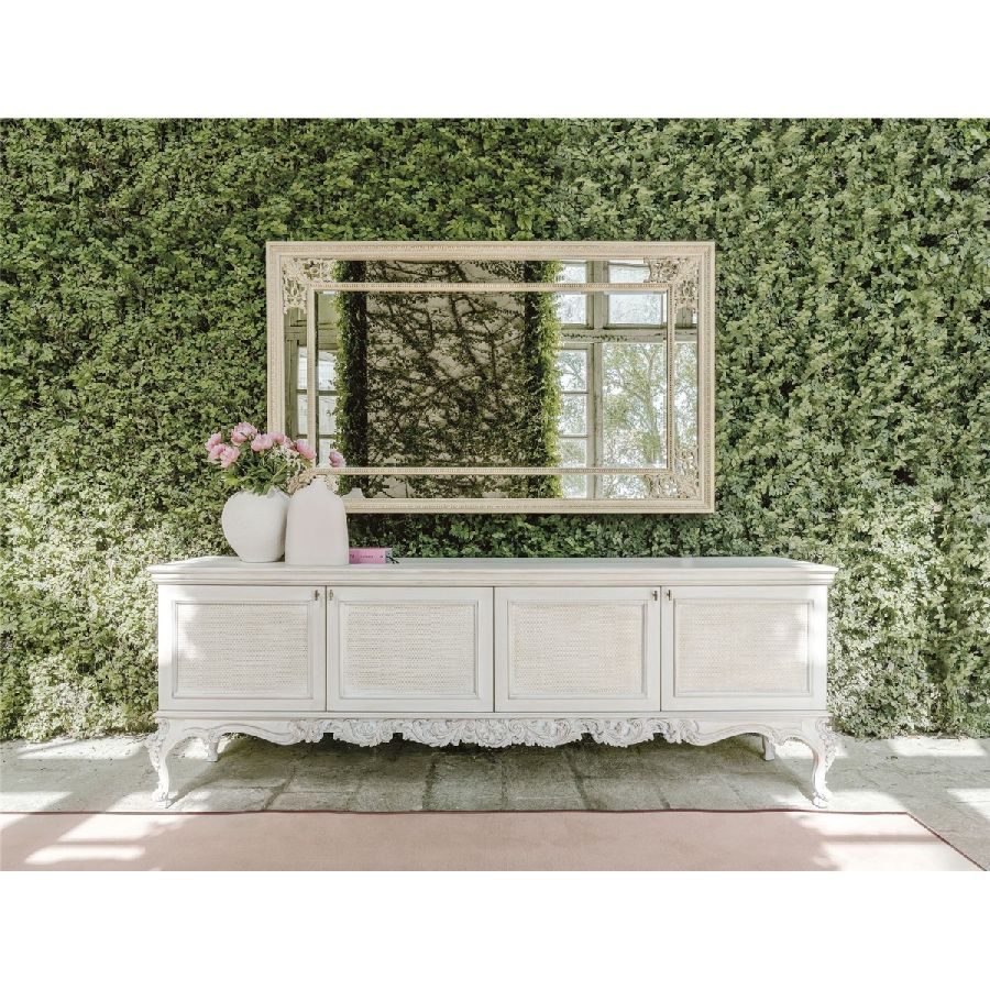A refined and unique piece of furniture, this sideboard features doors made of white Rattan cane, with a weave that emulates fabric but offers a more pronounced texture. The carved wooden base complements the dense Rattan cane, finished in LAFM lacquered brushed French tempera white meringue, with a base in gold leaf. This design showcases the perfect balance of natural materials and luxurious detailing, making it a standout piece for any space.