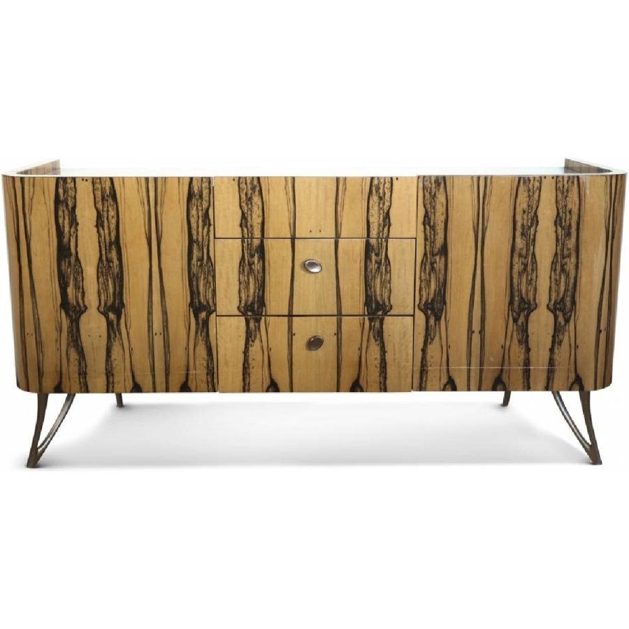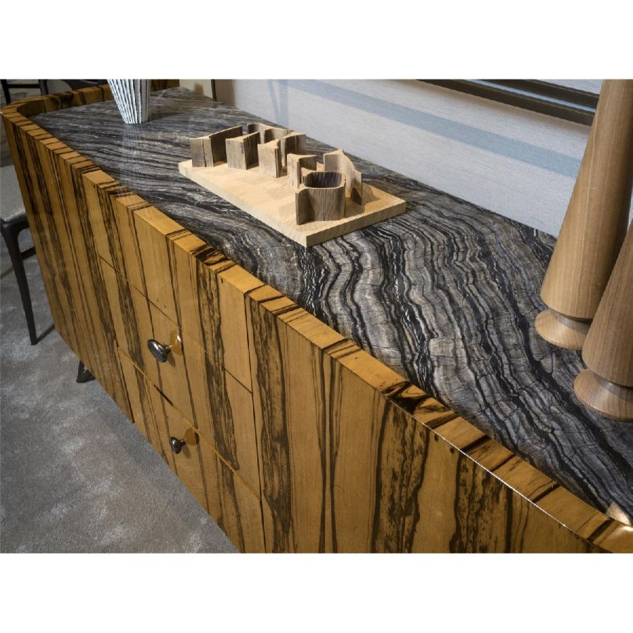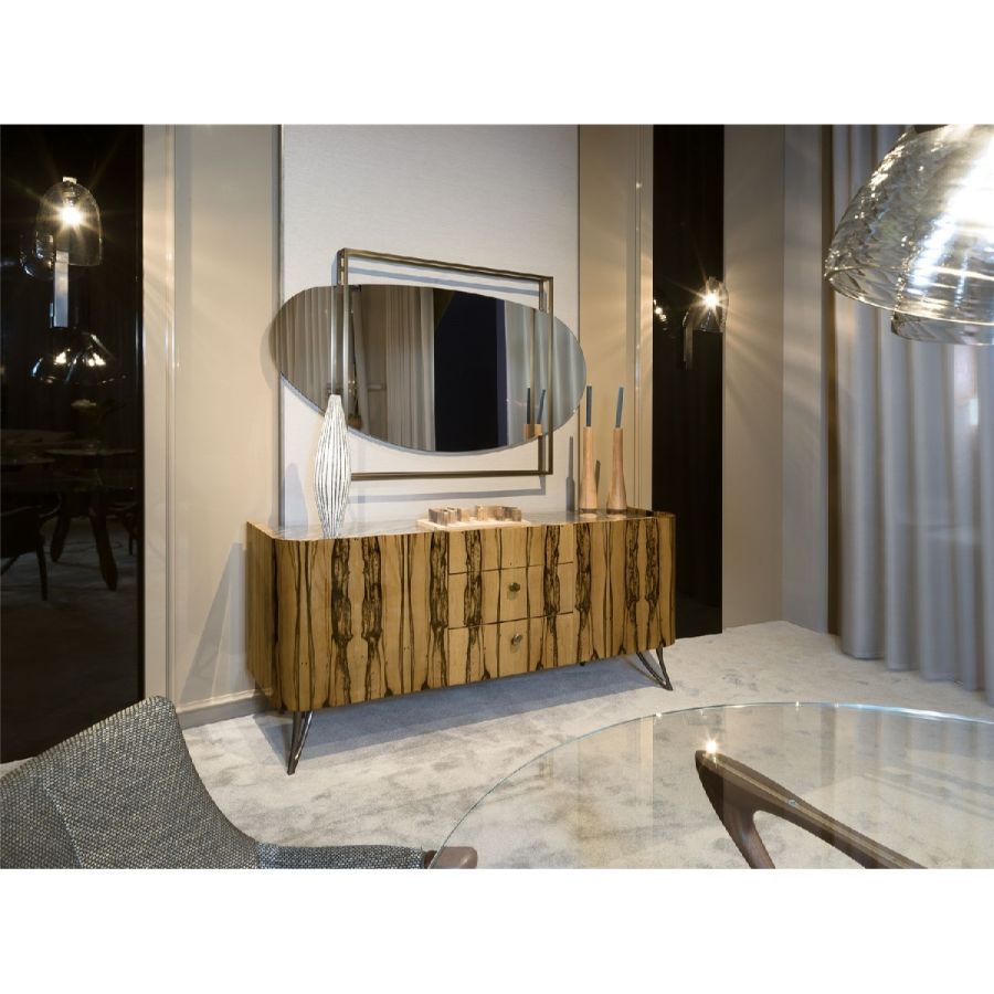 This sideboard features a structure veneered in white Ebony with a polished polyester finish and a Silver Wave marble top. Sculptural feet, knobs, and internal elements are finished in dark nickel brass, adding a sleek, modern touch. Inside, LED lights enhance the elegance and functionality of the piece. Designed by Ezio Bellotti, this sideboard combines sophistication with innovative design, making it a perfect addition to any luxurious interior.