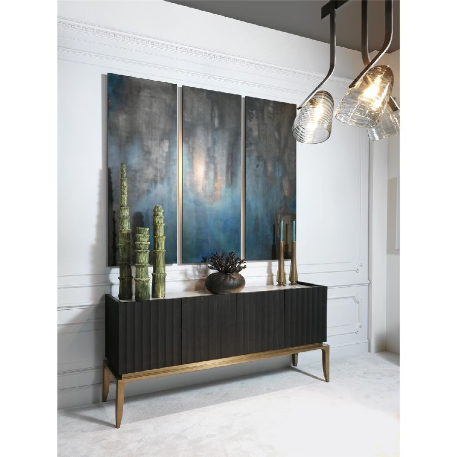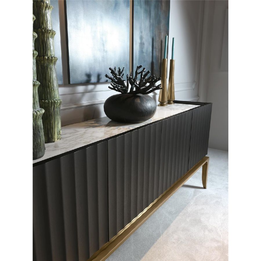 This refined sideboard features four doors crafted from plywood with MDF veneered ash, finished in urban black, and complemented by a base in bronze lacquered ash wood. The elegant Calacatta gold marble top adds sophistication and luxury to the piece. A perfect blend of functional design and timeless beauty, this sideboard offers ample storage space while enhancing the aesthetic of any interior.