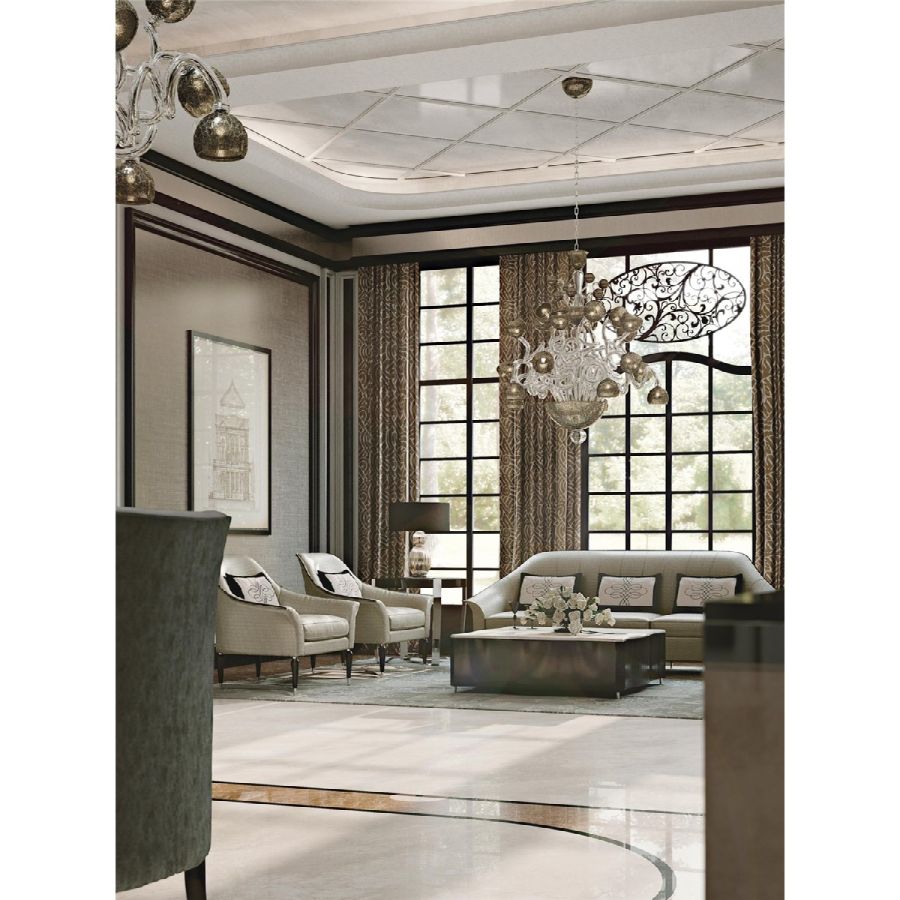 The sofa is elevated by its chromed brass end-feet, adding a contemporary edge to its overall design. These sleek, metallic feet contrast beautifully with the soft fabric and leather, creating a balanced and striking visual. This combination of quality materials and thoughtful design makes the sofa a versatile and timeless choice for any space.