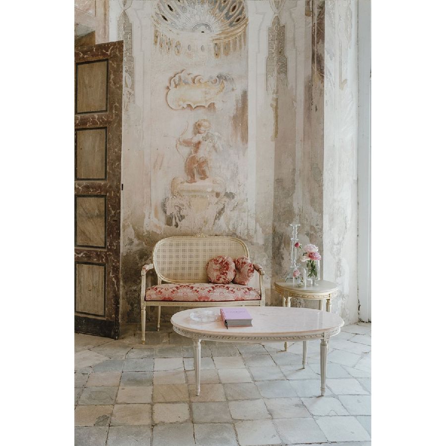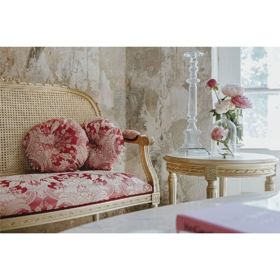 This small sofa is a charming and sophisticated piece that adds a touch of elegance to any space. Upholstered in exquisite damask fabric, it is enhanced with a backrest in Vienna straw, making it both stylish and comfortable.