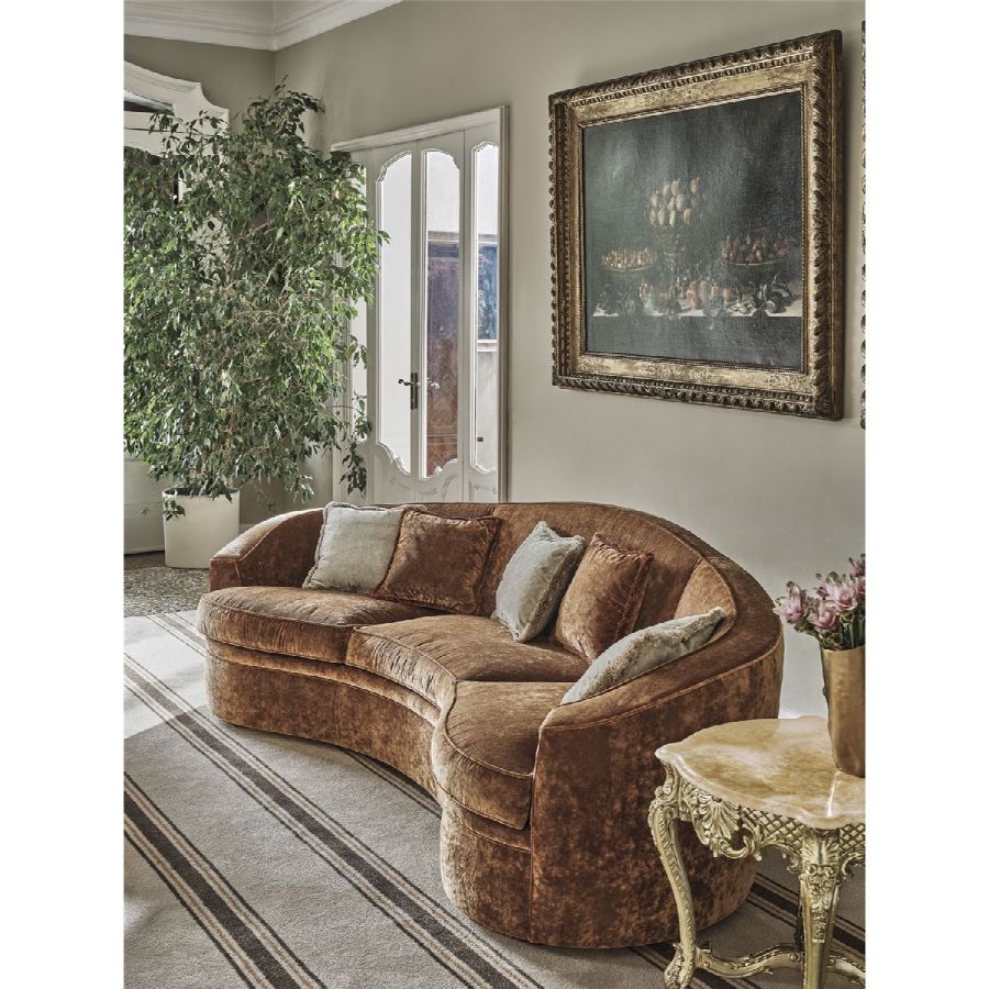 This sofa is available in a variety of fabrics as per samples, offering flexibility in customization to suit your space. The decorative cushions, filled with a feather mix, add a touch of softness and luxury. The cover is non-removable, enhancing the seamless design of this refined piece.