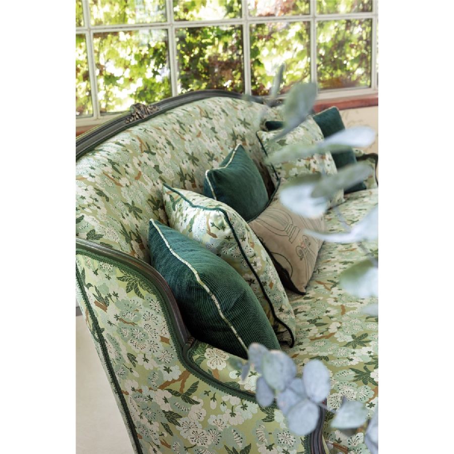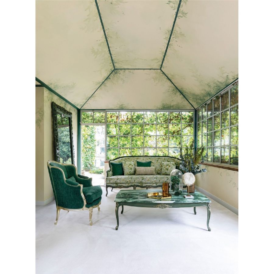 The carved wood frame, finished in lacquered and brushed Lotus Green French tempera, is enriched with Silver Gold details, adding a touch of timeless grandeur. Designed for both comfort and aesthetics, this masterpiece enhances any living space with its regal charm. Designer: Bellotti Ezio Team