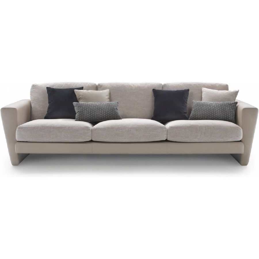 The feet are made from aluminum alloy with a satin-nickel finish in either natural or black. The structure is crafted from solid fir wood and poplar plywood, with springing on elastic bands. The shell is padded with polyurethane of different densities, while the backrest and seat are filled with polyurethane covered with feather flaps. Upholstery is available in both fabric or leather. Decorative cushions are available as an accessory.