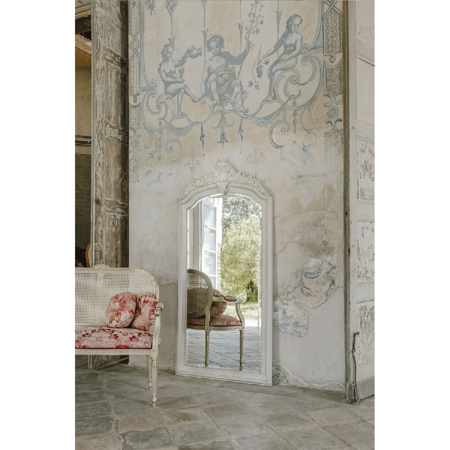 This Bellotti mirror is designed to embellish any room with its sophisticated frame finished in LAFM lacquered brushed French tempera white meringue, complemented by a base of gold leaf. The carved wooden frame adds a refined touch to the mirror, making it a standout piece that enhances the elegance of any space. Designed by the Bellotti Ezio Team, this mirror combines artistry and luxury, bringing timeless beauty to your home.