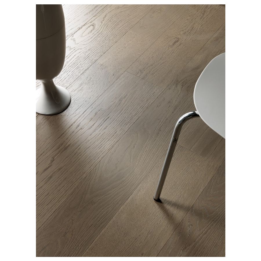 Cloud är ett borstat ekträgolv med delikata nyanser i mörkgrå toner och en matt effekt som ges av den lätta borstningen på ytan. Träets naturlighet förblir estetiskt oförändrad tack vare vattenbaserad lackering, de använda bearbetningsteknikerna och det noggranna urvalet av råmaterial som ger ytan hårdhet, stabilitet och hållbarhet.