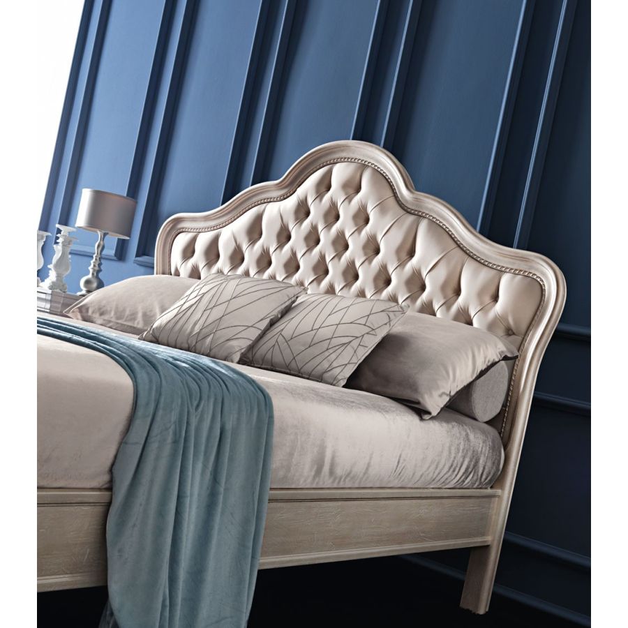 Classic wooden bed in romantic style with curved padded bedhead available with capitonné, quilted or smooth upholstery. The soft bedhead shape, the wooden curves winding all over the upholstery, make this bed a cozy nest everyone can customize: a wide palette of finishings can be combined to a large choice of fabrics or leathers for the bedhead upholstery. Wooden sides and footboard, also available in shaped version.