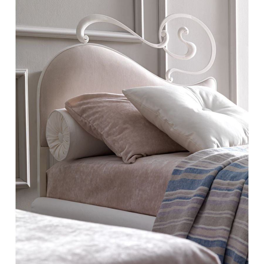 A neo-classic bed with a soft heart-shaped bedhead, enriched by the refined forged laser cutted iron detail. A bed with perfect symmetry, enchanting with its different possibility of decoration and combination with fabrics or leathers for the upholsteries of bedhead and bedrail. The curved iron detail is available as right or left to create the perfect contemporary atmosphere for your home.