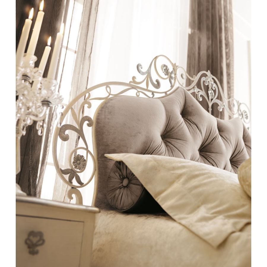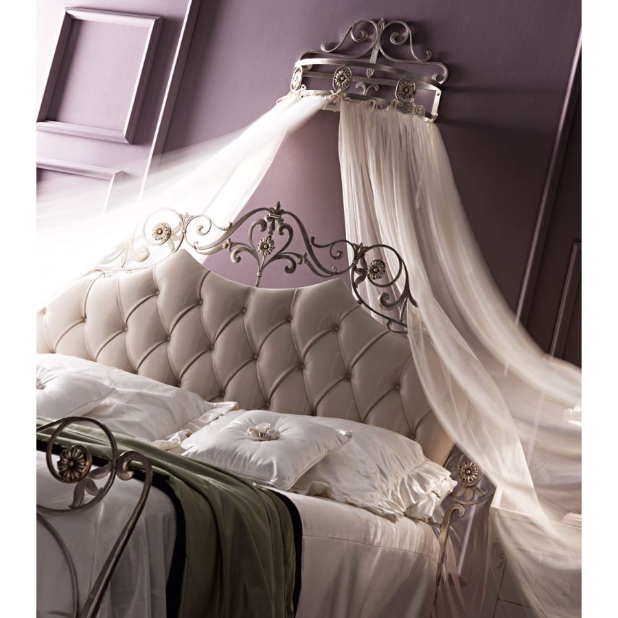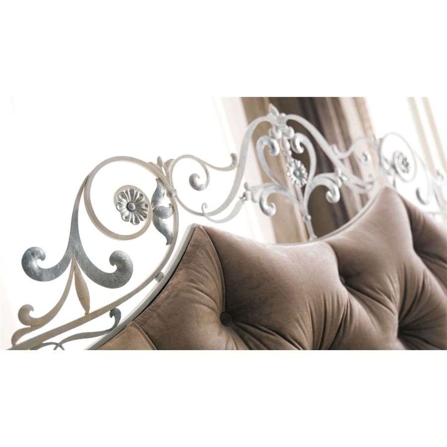 Classic, elegant, flamboyant and yet sophisticated hand wrought-iron bed, with hand-forged details. A bed with opulent and rich lines, where decorative details underline the high technical value of the craftsmanship. Bedhead is enriched by a capitonné, quilted or smooth padded panel upholstered in a wide range of fabric, leathers, eco-leathers.