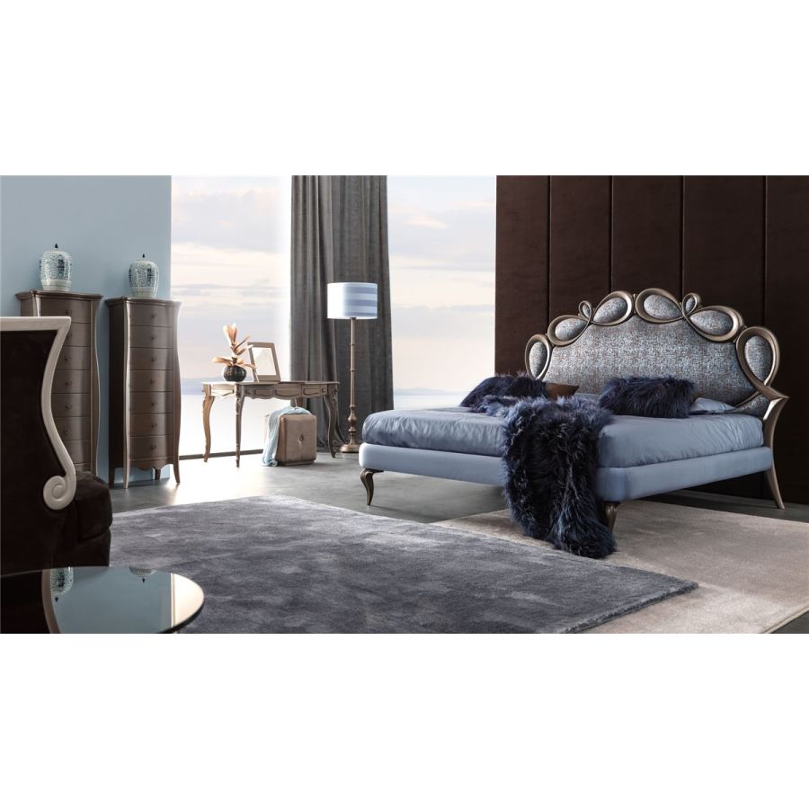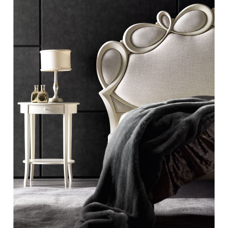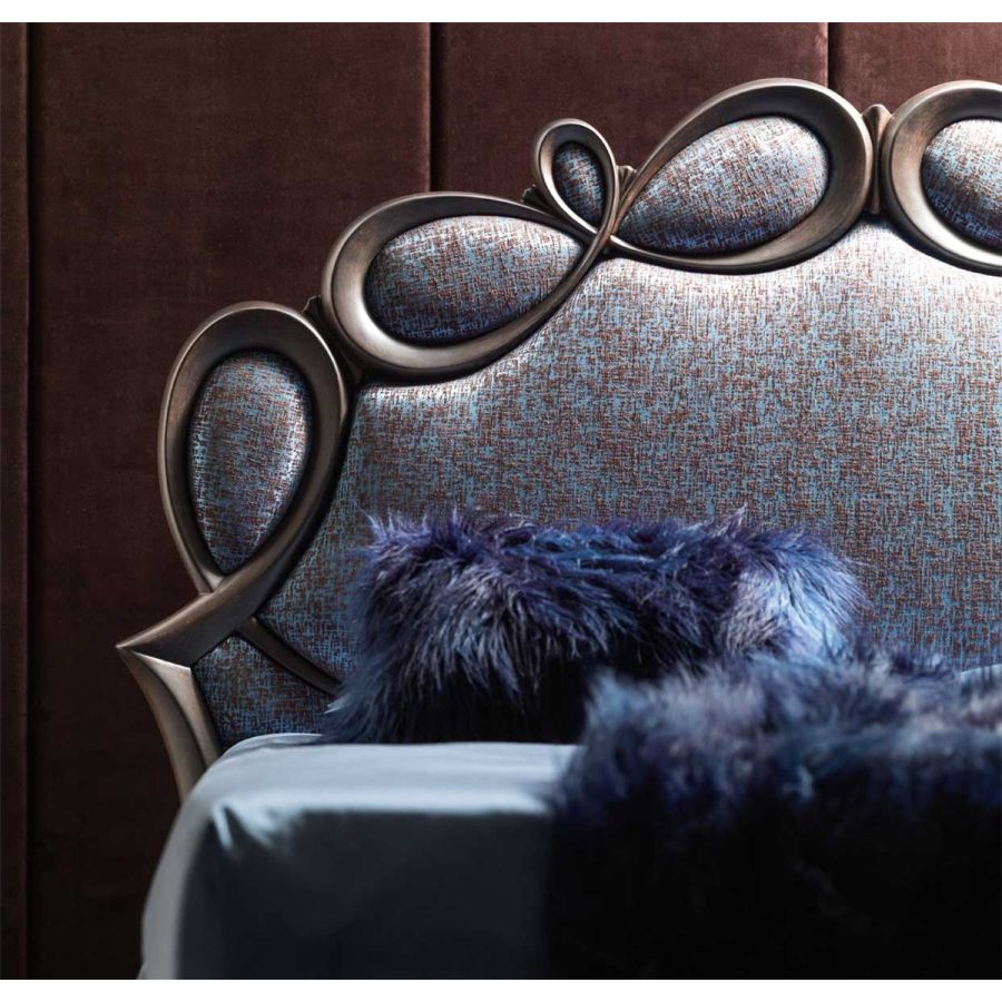 A shaped and carved solid wooden bed with an extremely refined and elegant line, enhanced by the upholstered bedrail and the solid wooden legs. The bed is featured by a curvaceous shape, typical of the ornametal “Art Nouveau” style. The charming outline is in the meantime sincere and original. The precious padding and upholstery are integrated also into the crowned frame offering a striking design.