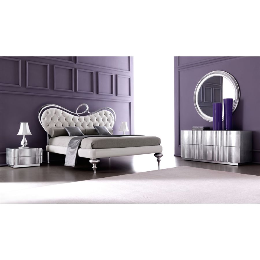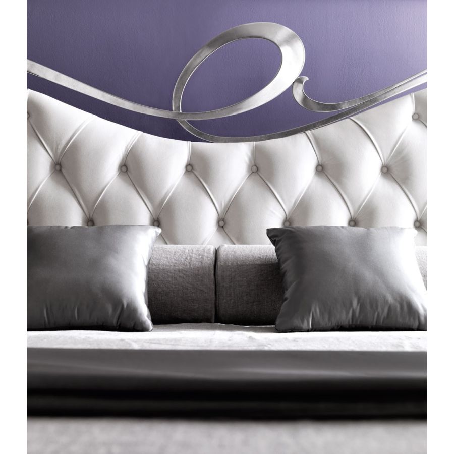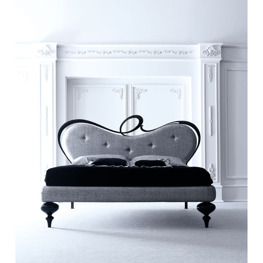 A bed with a peculiar bedhead, thanks to the curved, unique, unforgettable shapes in hand-shaped iron, modeled by hand, enriched by always different and personalized padding. A bed with a distinctive, memorable and iconic graphic sign Perfect the combination with the padded bedrail and the solid wooden leg finished in a wide range of colours.