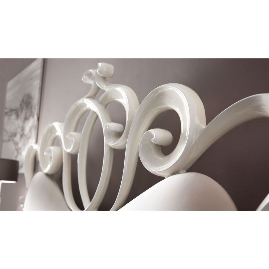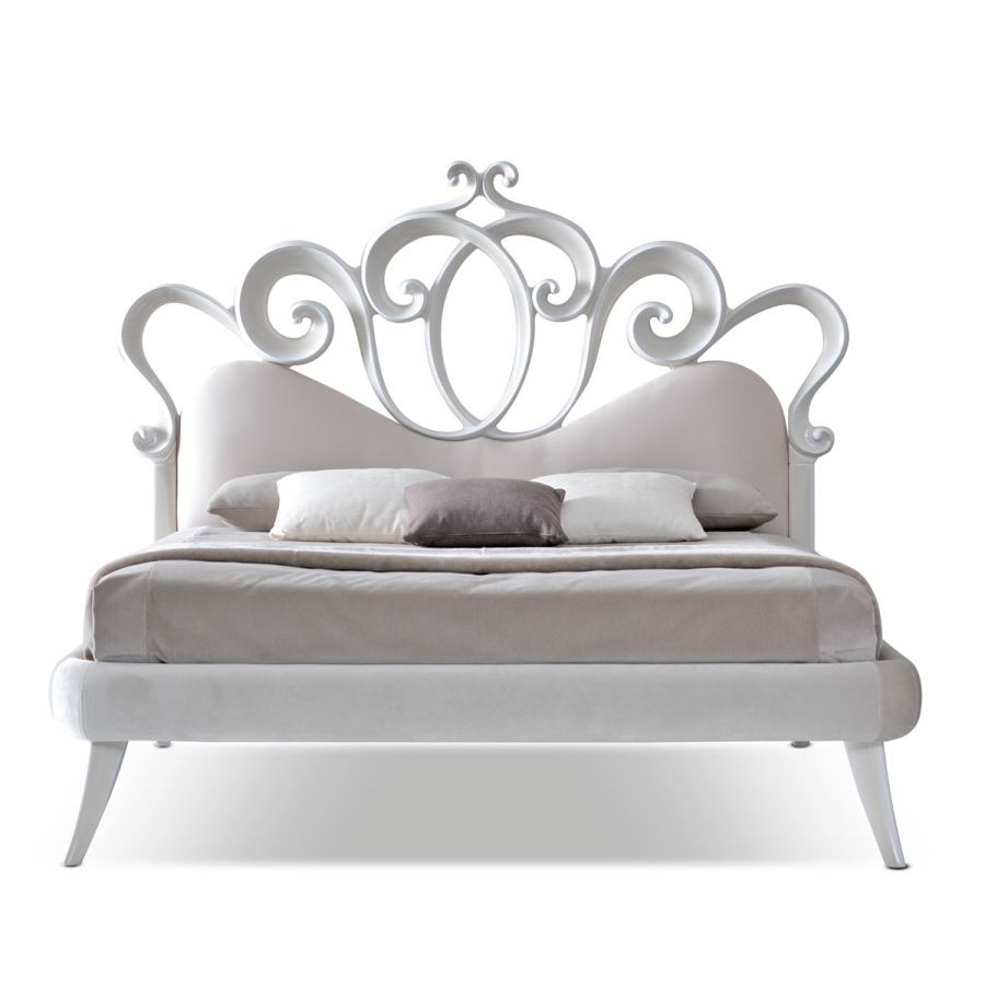 Whimsical interweaving of spirals that, like a game, are transformed into three-dimensional shapes and lines. Sofia, Romantic and refined woodenbed with headboard made of shaped and carved solid wood, complete with padded panel that can be covered in fabric, leather or eco-leather, which follows the elegant curved lines of the central part of the headboard.