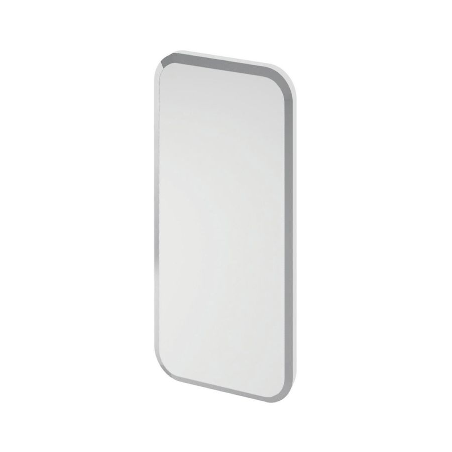 Rectangular mirror with rounded corners.