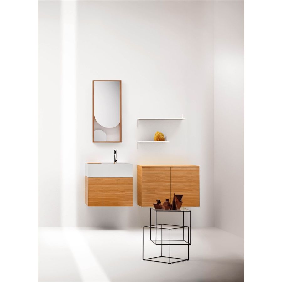 Wall-hung washbasin in mineralmarmo® built into one-door cabinet in larch wood.