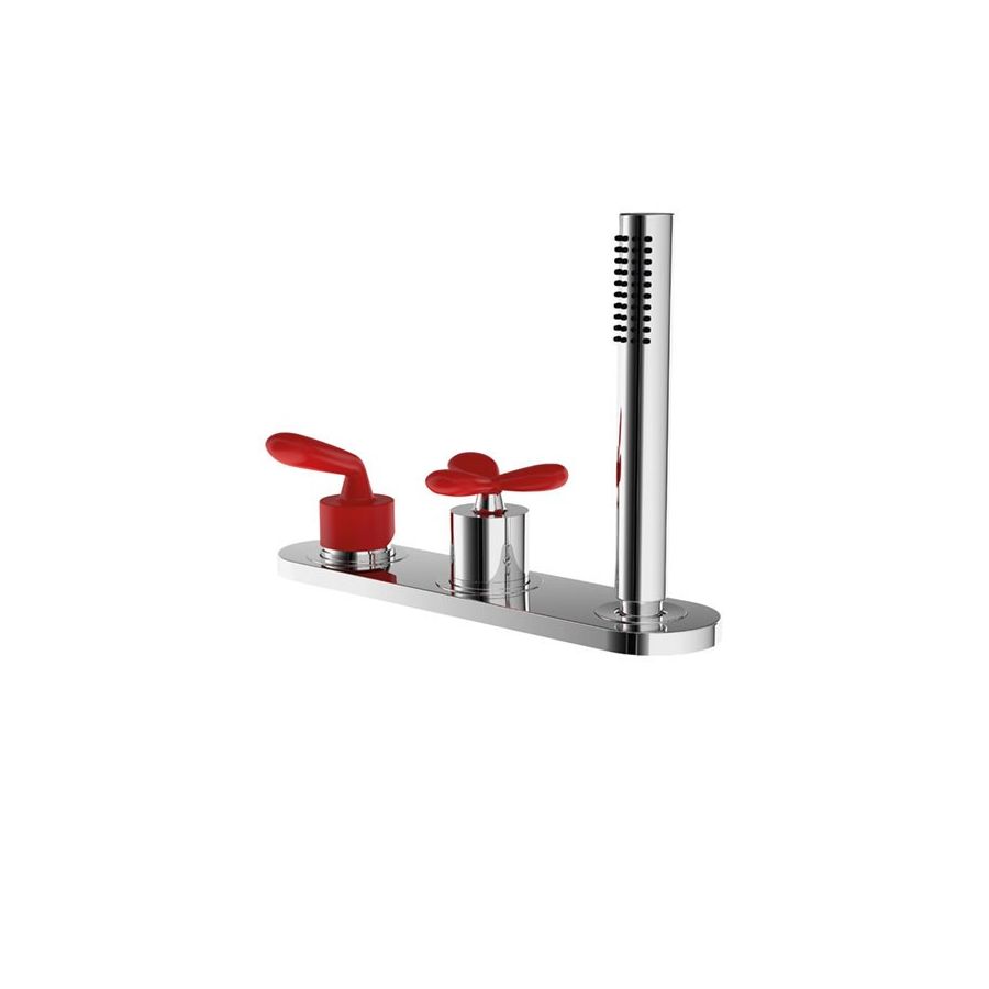 Deck mounted bath mixer with red levers, hand shower and diverter.