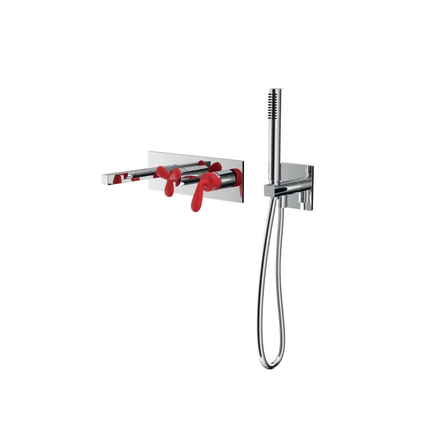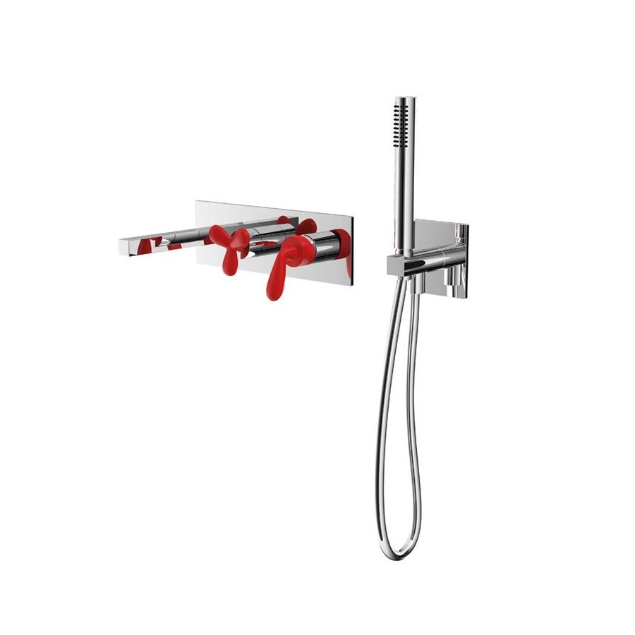Wall-mounted bath mixer with red levers, spout, hand shower and diverter.
