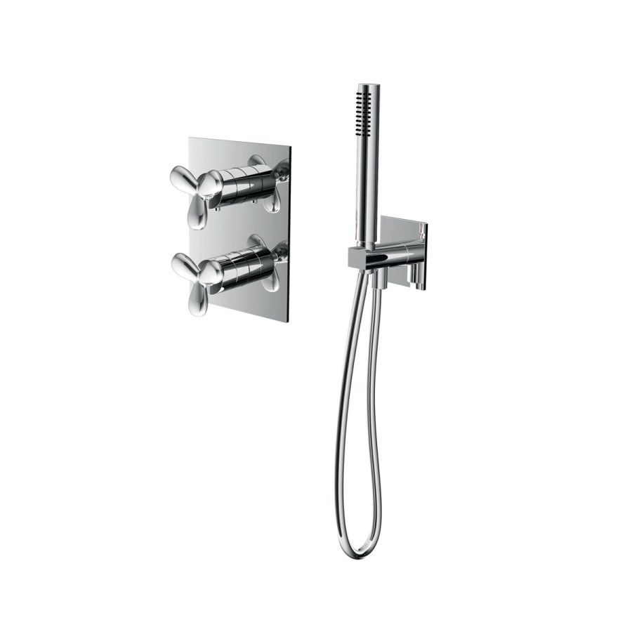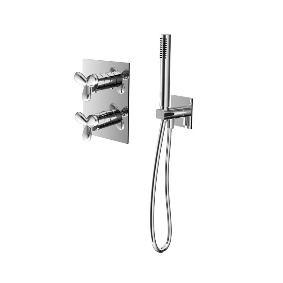 Thermostatic shower group with chrome-plated levers and hand shower.