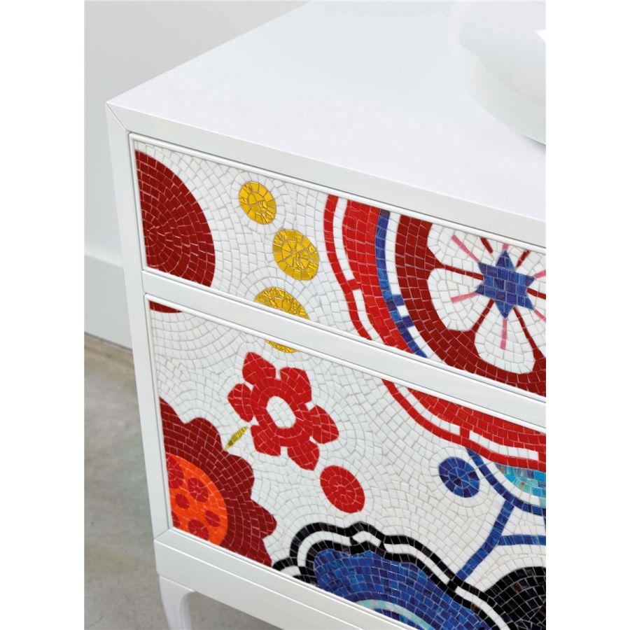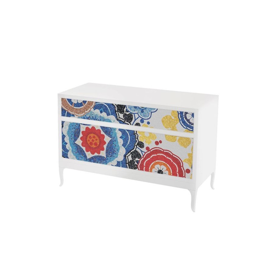Polished lacquer mdf/hdf drawer unit with glass mosaic. No washbasin hole. Two drawers.