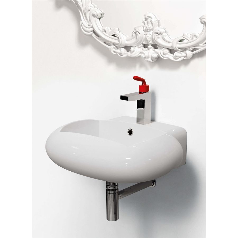 Wall-hung ceramic washbasin.