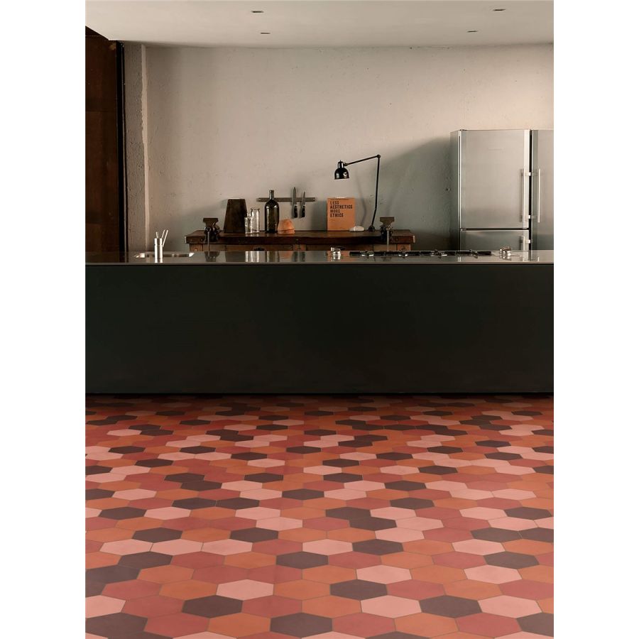 Tiles made entirely by hand using high-strength cement blended with coloured oxides. Square (200x200 mm) or hexagonal in shape (200x230 mm), 14 mm thick, the tiles are cold pressed and treated to protect their surface and ease the cleaning.