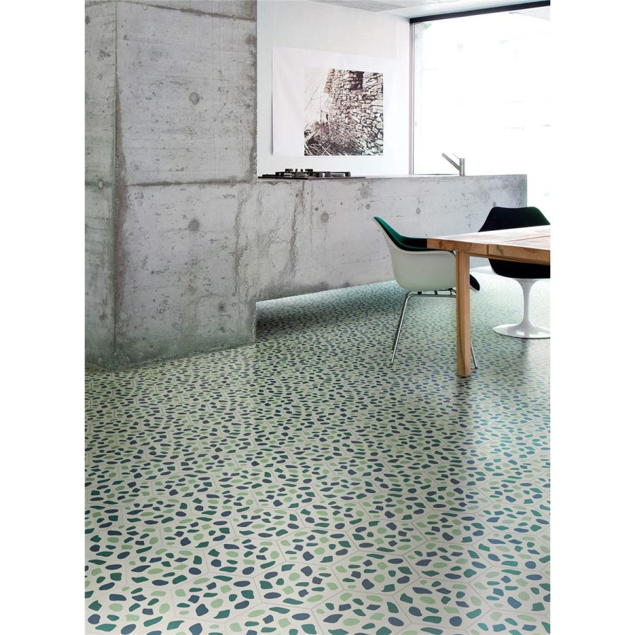 Tiles made entirely by hand using high-strength cement blended with coloured oxides. Square (200x200 mm) or hexagonal in shape (200x230 mm), 14 mm thick, the tiles are cold pressed and treated to protect their surface and ease the cleaning.