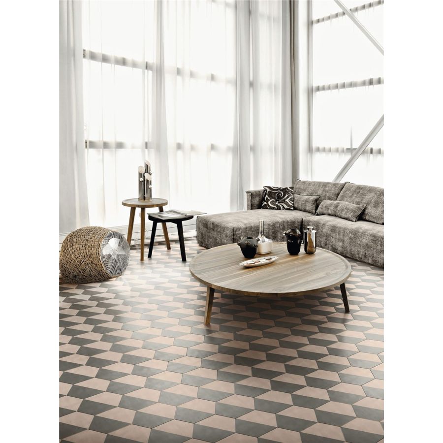 Tiles made entirely by hand using high-strength cement blended with coloured oxides. Square (200x200 mm) or hexagonal in shape (200x230 mm), 14 mm thick, the tiles are cold pressed and treated to protect their surface and ease the cleaning.