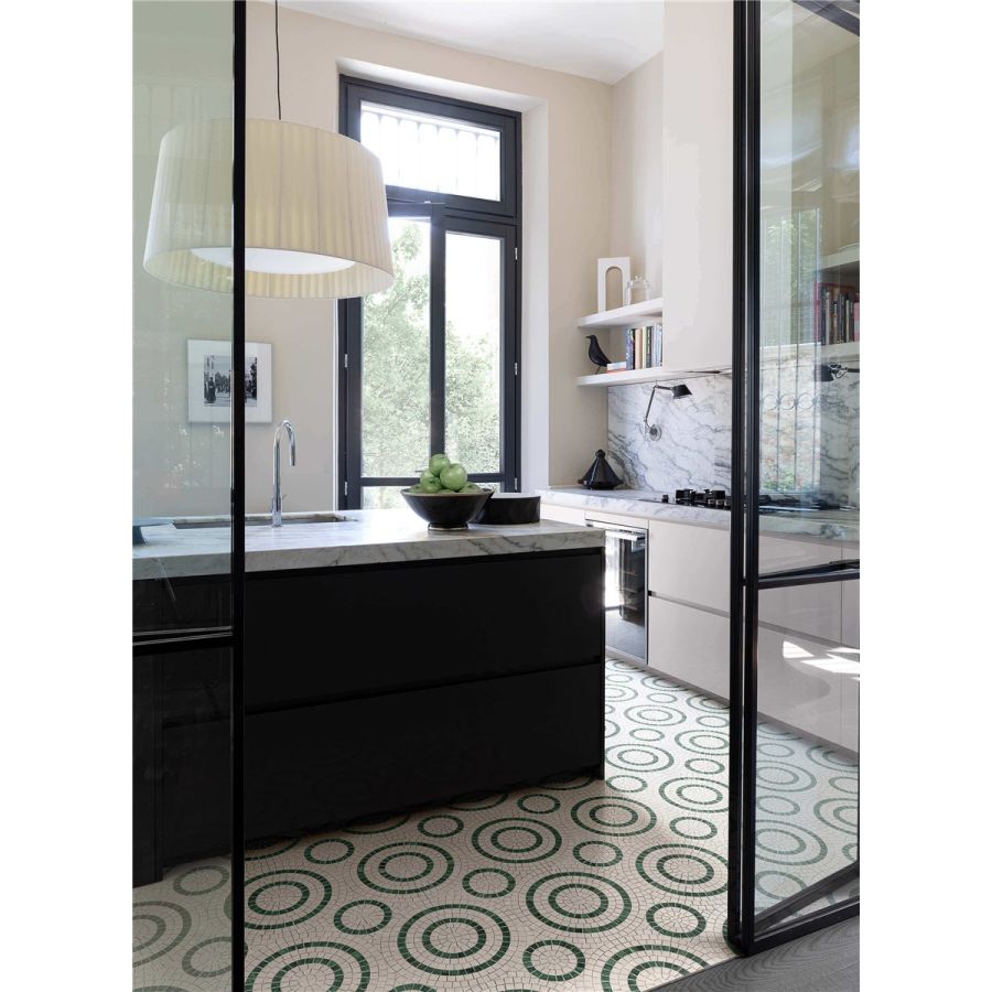 The decorative patterns in the marmosaico collection are made with honed marble mosaic tesserae, measuring 1,5x1,5 cm, with matt finish, cut to size and laid by hand to follow the design motif.