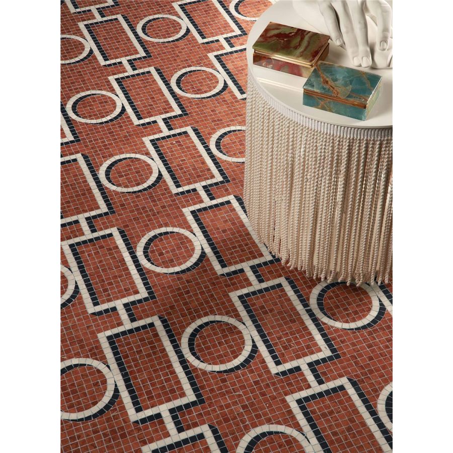 The decorative patterns in the marmosaico collection are made with honed marble mosaic tesserae, measuring 1,5x1,5 cm, with matt finish, cut to size and laid by hand to follow the design motif.