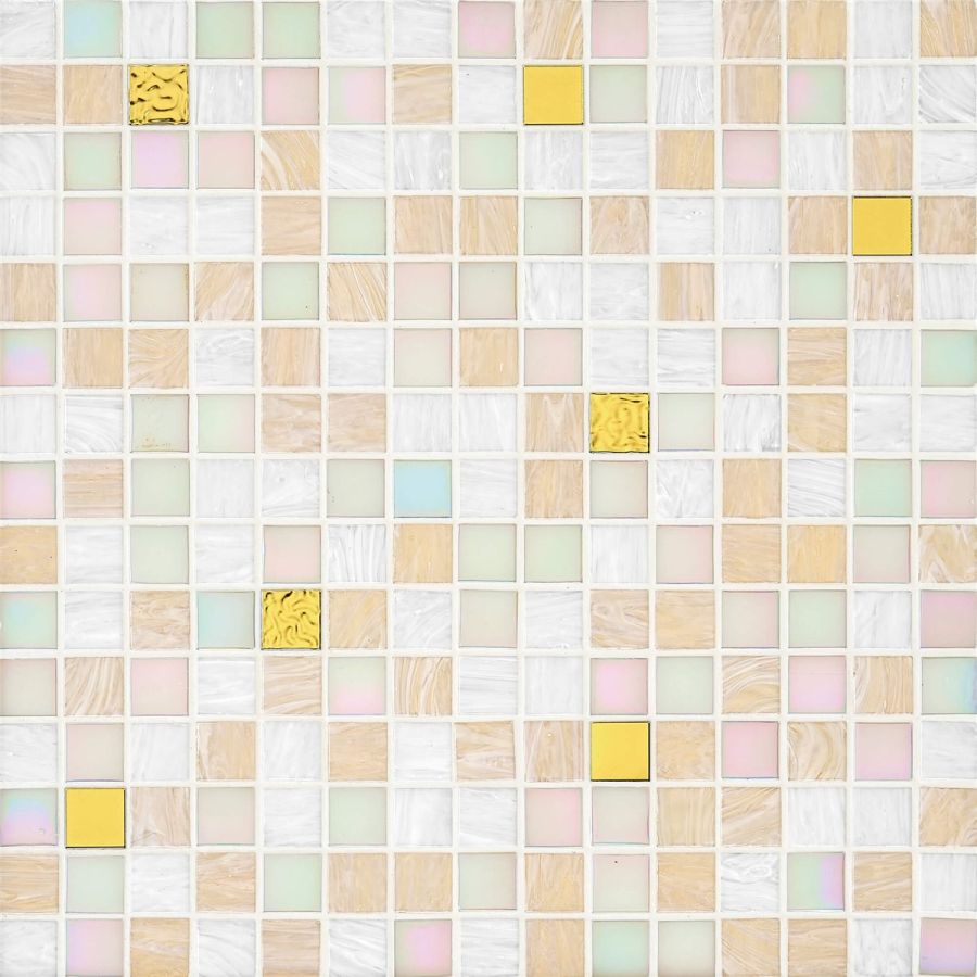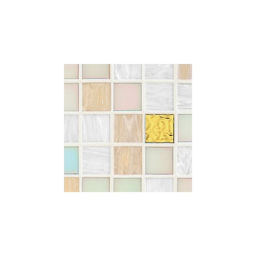 Glass mosaic composed of beveled, randomly arranged square tesserae. The oro bis tesserae present in the blend are fashioned with 24 kt gold leaf between two protective layers of glass.