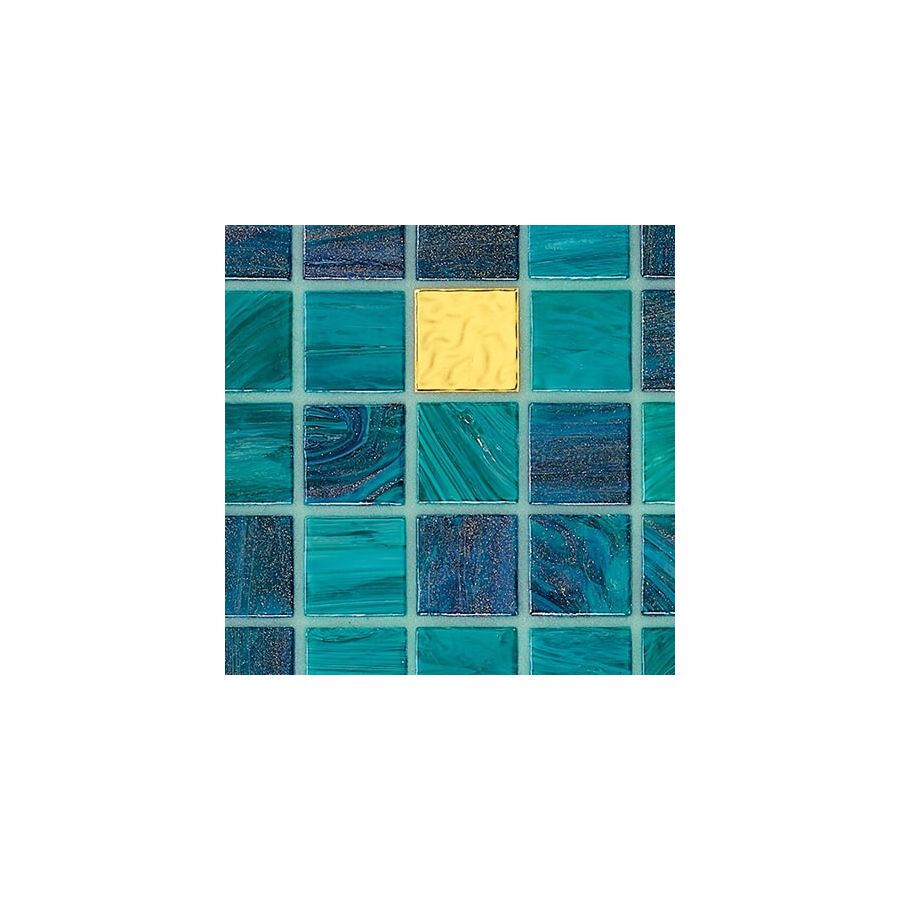 Glass mosaic composed of beveled, randomly arranged square tesserae. The oro bis tesserae present in the blend are fashioned with 24 kt gold leaf between two protective layers of glass.