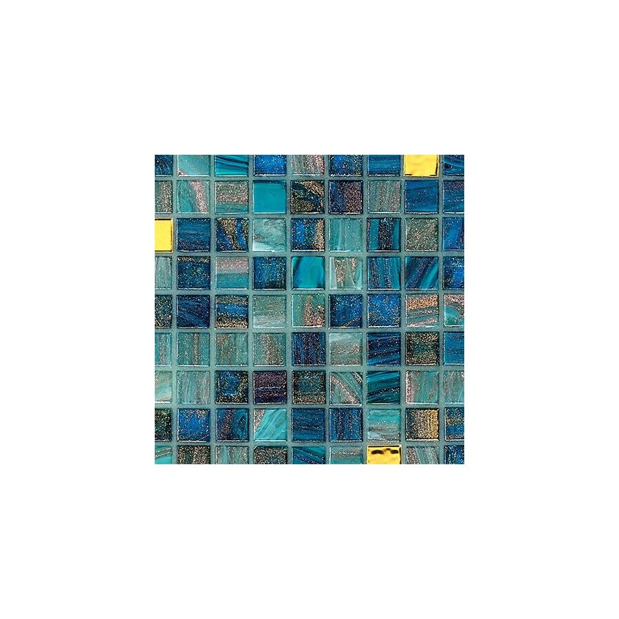 Glass mosaic composed of beveled, randomly arranged square tesserae. The oro bis tesserae present in the blend are fashioned with 24 kt gold leaf between two protective layers of glass.