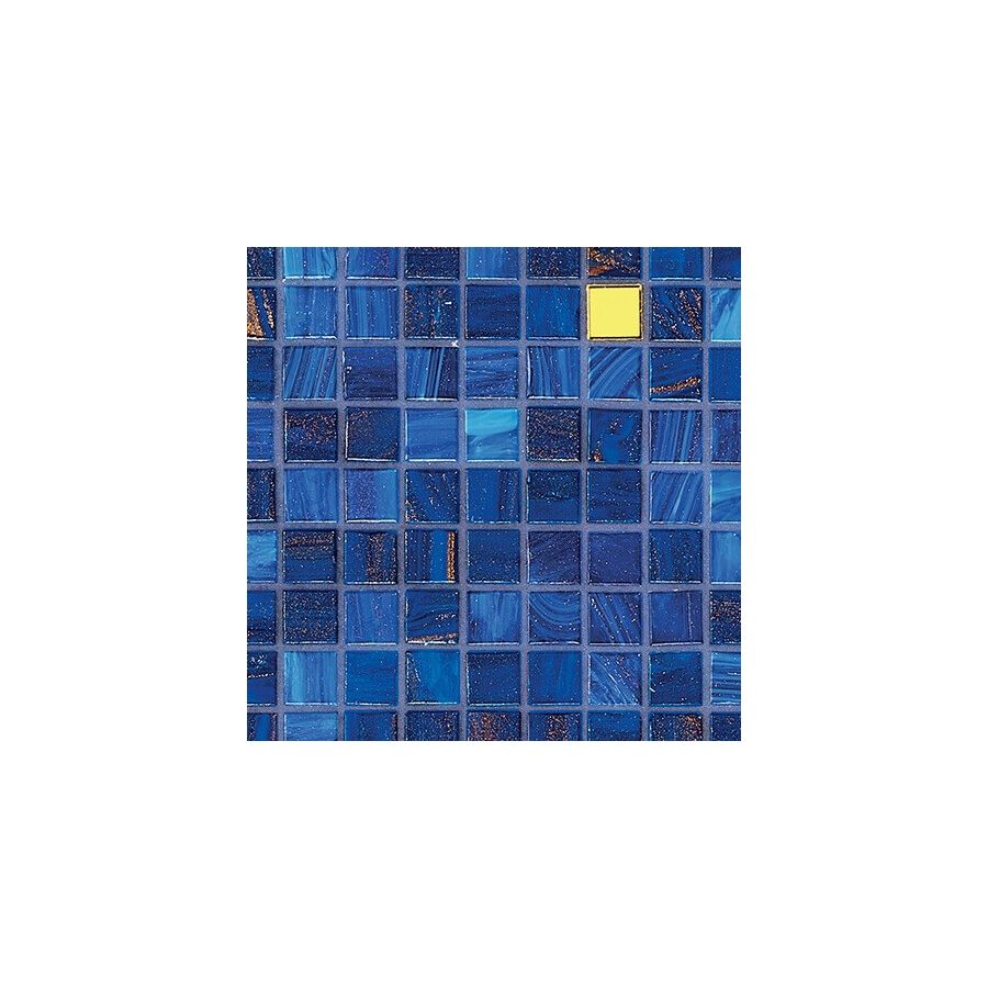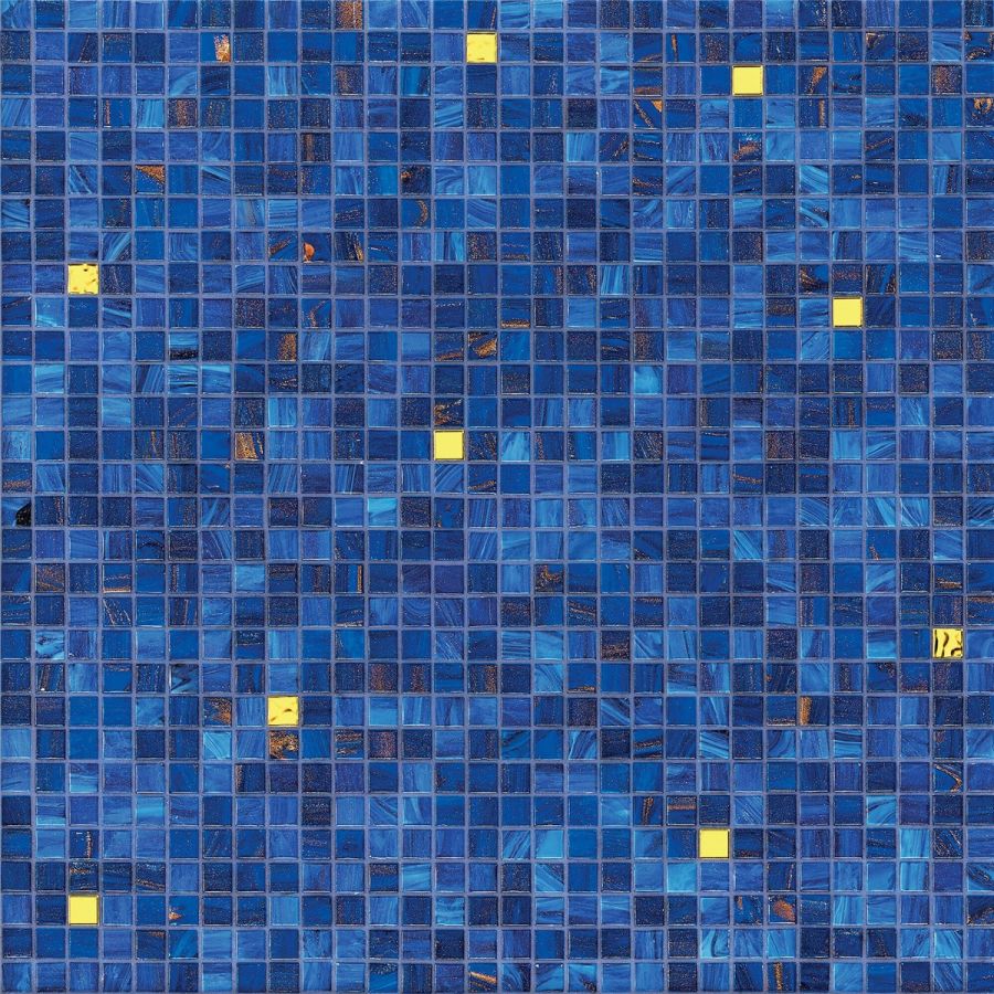 Glass mosaic composed of beveled, randomly arranged square tesserae. The oro bis tesserae present in the blend are fashioned with 24 kt gold leaf between two protective layers of glass.