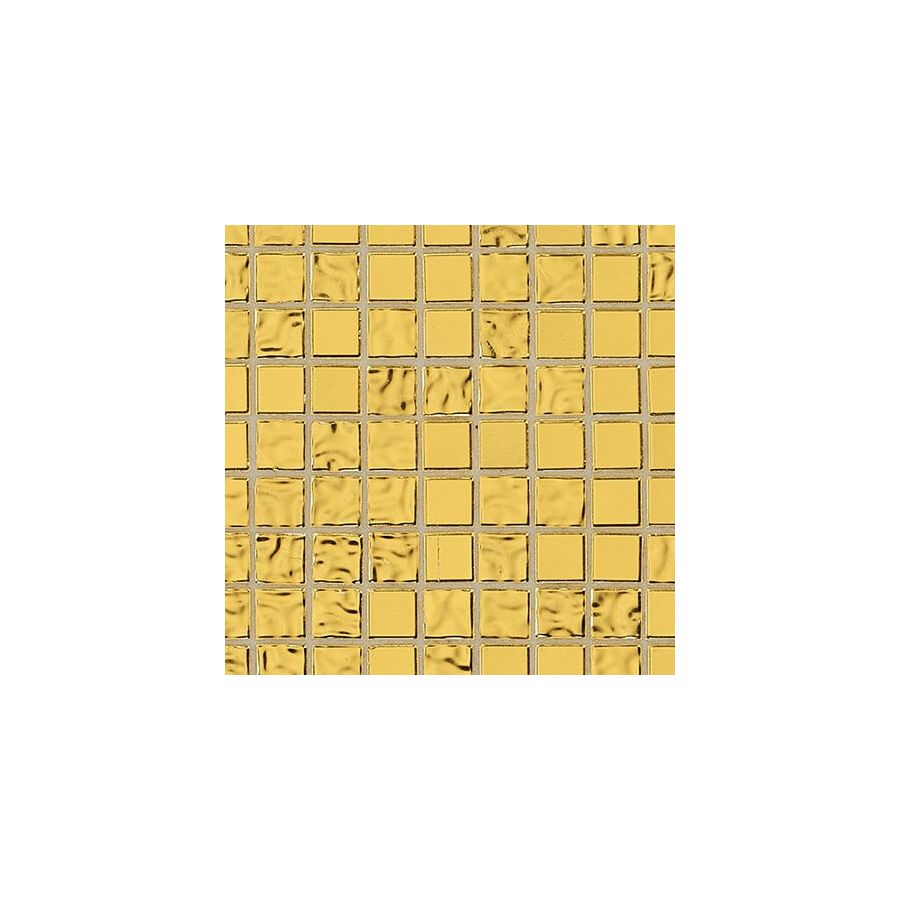 Glass mosaic composed of beveled, randomly arranged square tesserae. The oro bis tesserae present in the blend are fashioned with 24 kt gold leaf between two protective layers of glass.
