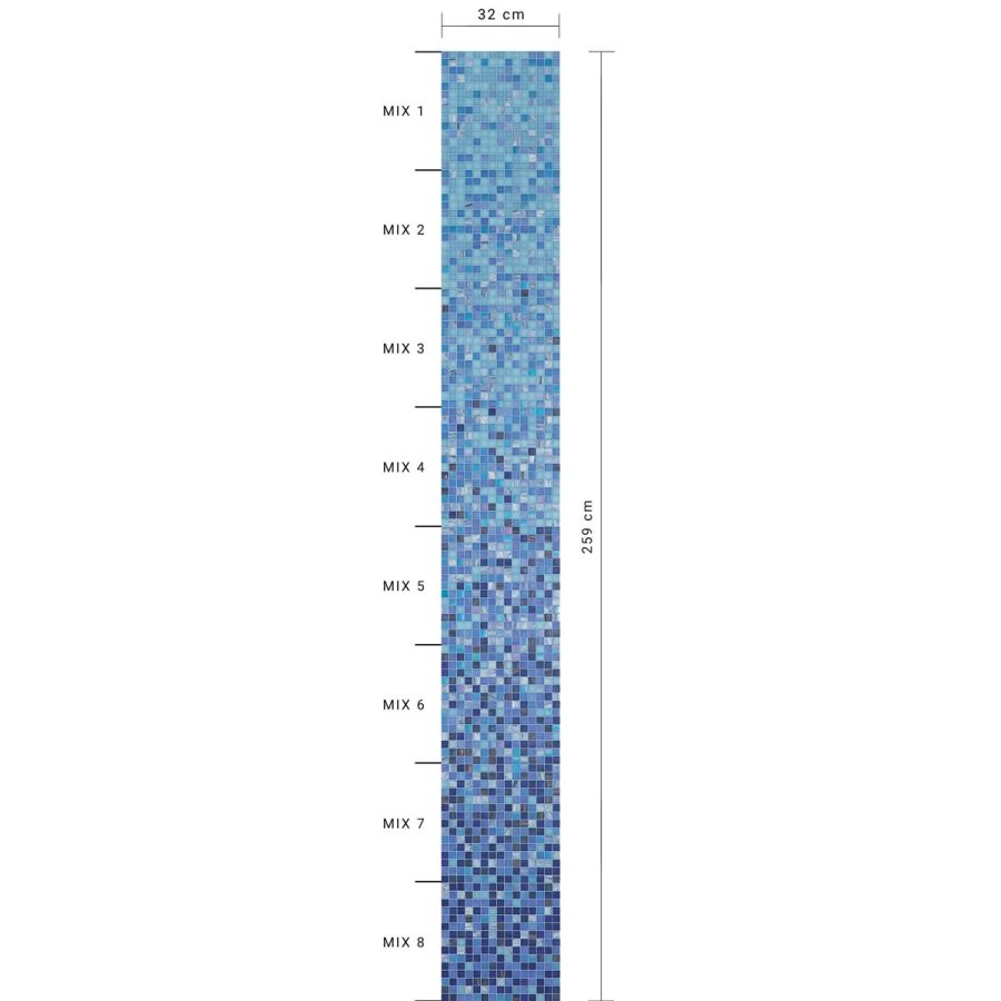 The gerbera whiteless shading blend is a sequence of mosaic blends arranged in a gradation from light to dark, made with 20x20 mm glass tiles. The shading blend is made up of 8 sheets, with one mix per sheet (mix 1, mix 2, etc.), For an overall height of 259 cm. The individual mixes of the standard shading blends can be sold per sqm. This item is sold by the module. Module dimensions: 0.32x2.588 m (0.83 sq. m). For any customizations, click on “Request information”.