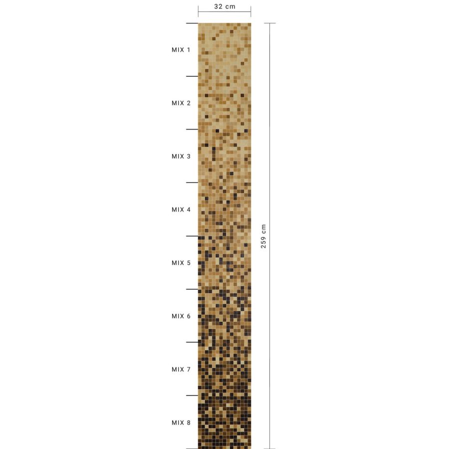 The new ambra whiteless shading blend is a sequence of mosaic blends arranged in a gradation from light to dark, made with 20x20 mm glass tiles. The shading blend is made up of 8 sheets, with one mix per sheet (mix 1, mix 2, etc.), For an overall height of 259 cm. The individual mixes of the standard shading blends can be sold per sqm. This item is sold by the module. Module dimensions: 0.32x2.588 m (0.83 sq. m). For any customizations, click on “Request information”.