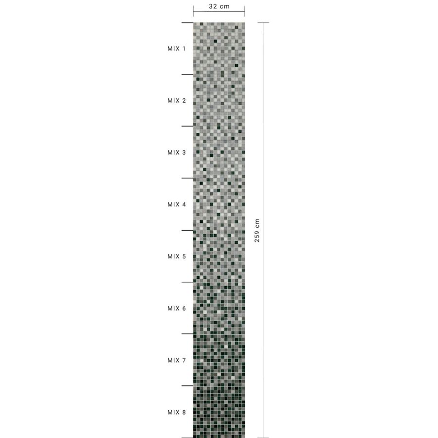 The new grigia whiteless shading blend is a sequence of mosaic blends arranged in a gradation from light to dark, made with 20x20 mm glass tiles. The shading blend is made up of 8 sheets, with one mix per sheet (mix 1, mix 2, etc.), For an overall height of 259 cm. The individual mixes of the standard shading blends can be sold per sqm. This item is sold by the module. Module dimensions: 0.32x2.588 m (0.83 sq. m). For any customizations, click on “Request information”.
