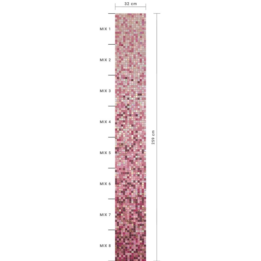 The oleandro whiteless shading blend is a sequence of mosaic blends arranged in a gradation from light to dark, made with 20x20 mm glass tiles. The shading blend is made up of 8 sheets, with one mix per sheet (mix 1, mix 2, etc.), For an overall height of 259 cm. The individual mixes of the standard shading blends can be sold per sqm. This item is sold by the module. Module dimensions: 0.32x2.588 m (0.83 sq. m). For any customizations, click on “Request information”.