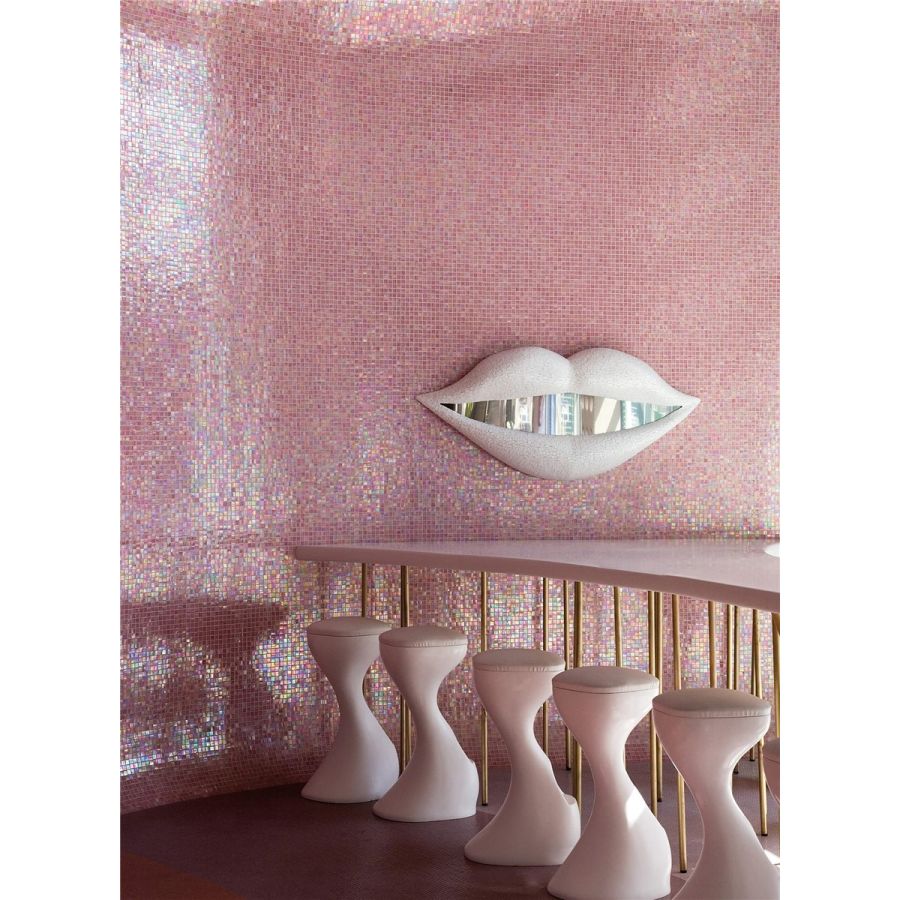 The gloss series is made up of glass tesserae that display iridescent surface reflections. They are produced and colored with oxides that, fusing completely with the glass, allow the creation of pure colors. The iridescence is achieved by spraying a chemical product on the incandescent glass tesserae that, reacting to the heat, produces this very sophisticated, elegant effect.