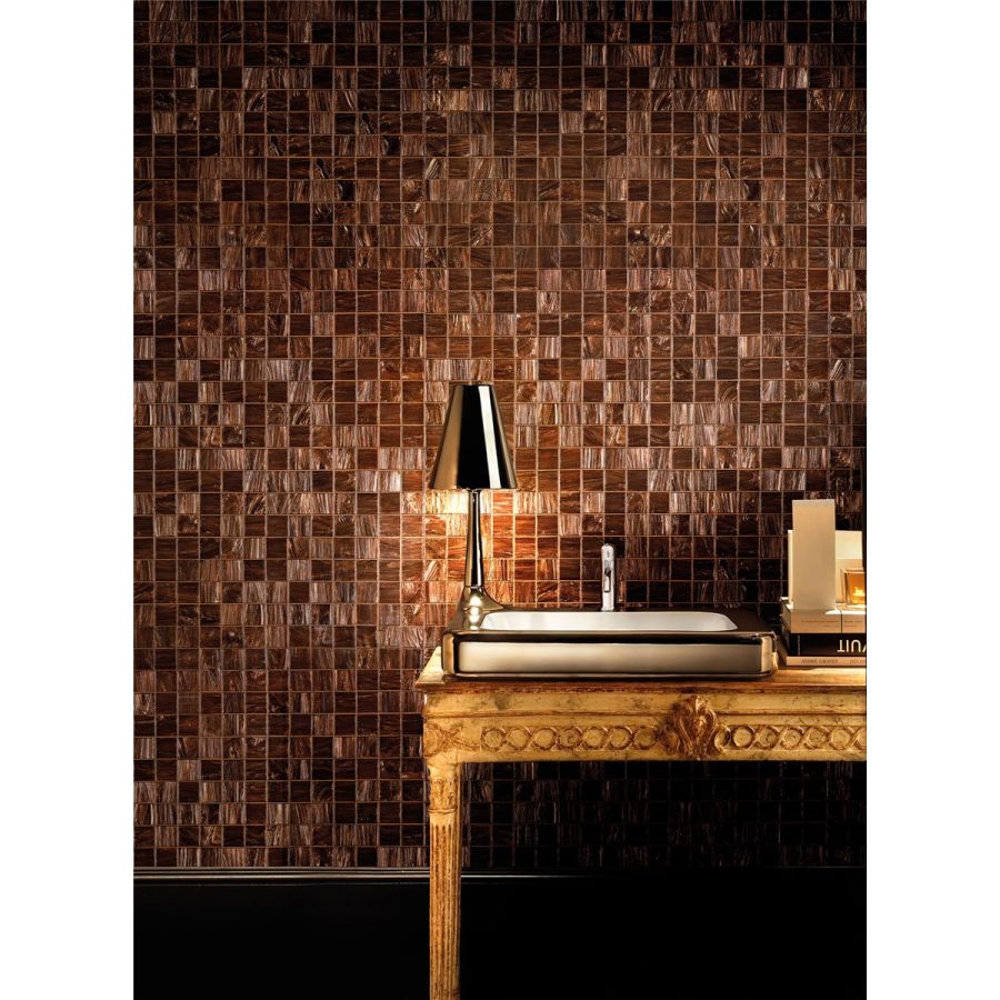 The le gemme series is fashioned using artisan techniques and expert hand-craftsmanship that make each tessera unique, luxurious and one-of-a-kind. The individuality of this series derives from the special glass-coloring technique that includes the addition of aventurine and colored enamel granules. Aventurine is a type of glass obtained through artisan craftsmanship, a technique passed down by the murano glass masters for centuries. Copper crystals mixed with brilliant metal oxides are found inside aventurine where they create a golden scintillating flamed effect in the mosaic tesserae.