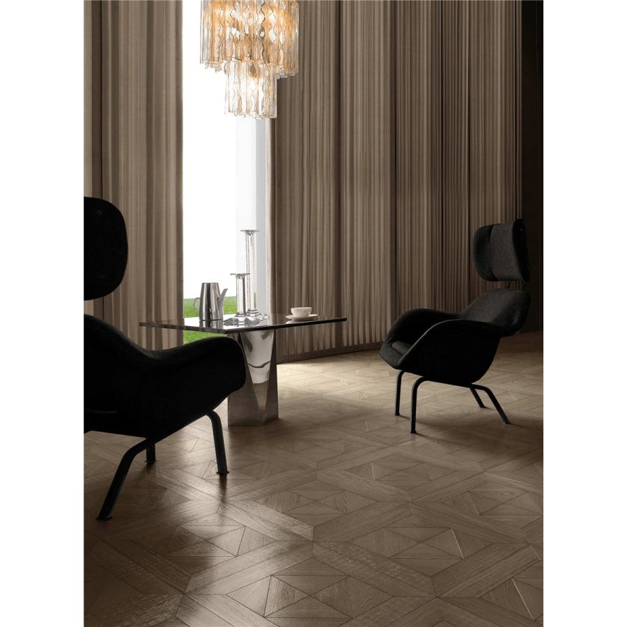Wood is a prefinished 15mm thick parquet consisting of a 4-mm-thick top layer of oak on a birch plywood backing, assembled according to the strictest production standards. Wood has excellent wear and stability results and can be laid on floors with radiant heating. The surface is brushed and finished with a varnish, which makes this product extremely resistant to stains and suitable for high-traffic floors. Wood is fire retardant, being approved to european fire reaction class cfl-s1, and meets the requirements dictated by the ce marking regulations for wood floors. Minimum order quantity: 30 sqm