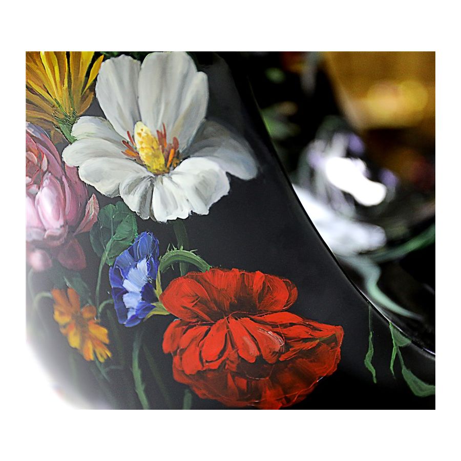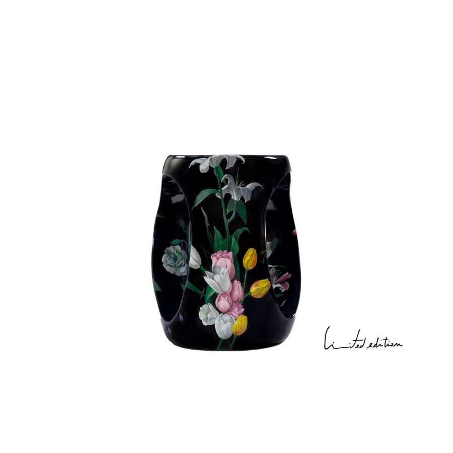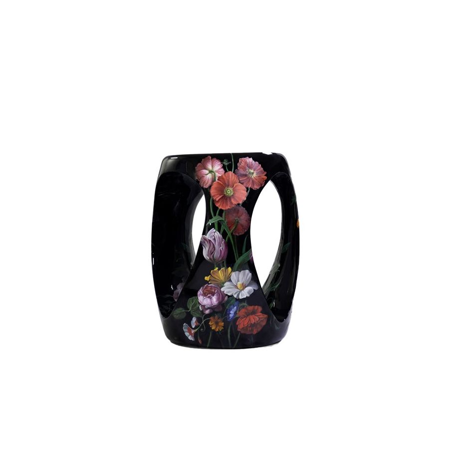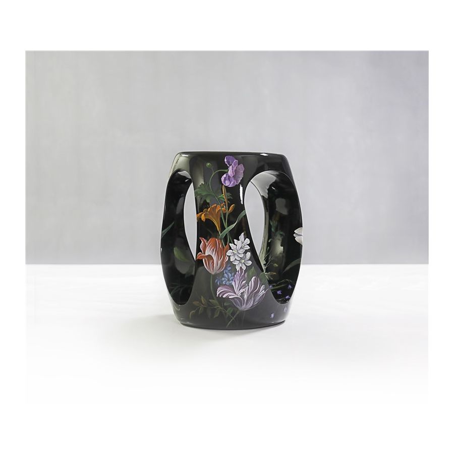 Floral is a soulful stool which evokes Portuguese Romanticism traditions thanks to its gentle flowers delineated with oil paint over a black background. It marries perfectly ancient painting techniques with contemporary design. The Floral art piece was born from the delicate oil painting, which gives a modern look to floral elements. The challenge of recreating an ancient technique to bring to life an Art stool was proposed to Santa Bárbara’s atelier, renowned in Portugal due to its high quality and detail in painting applied to restoration. Expertise in craftsmanship allowed master artisans to adapt this craft often used in furniture and murals. The result is a masterpiece filled with a unique elegance and detail which can only be achieved by hand craft. Its pictorial quality is remarkable.