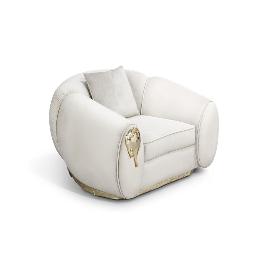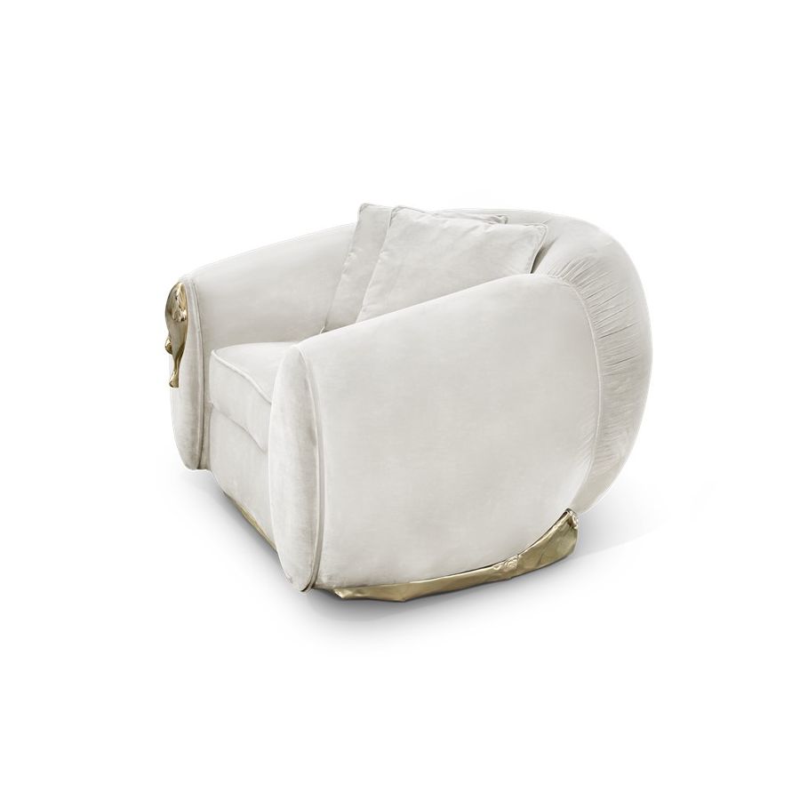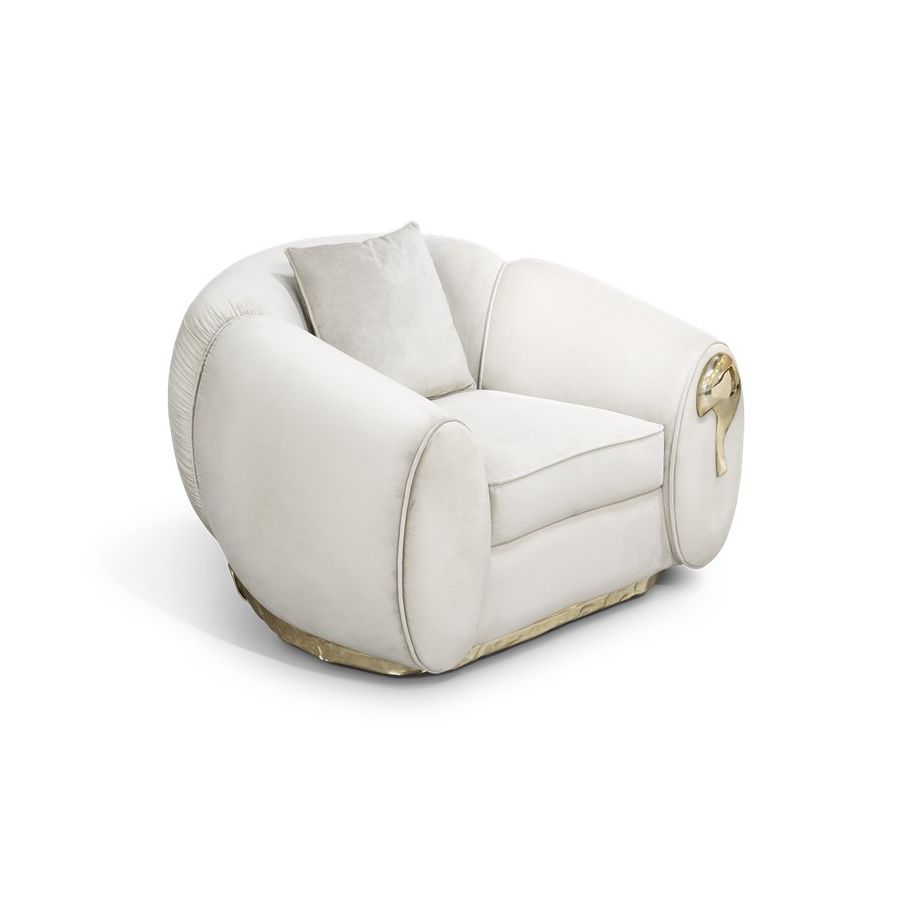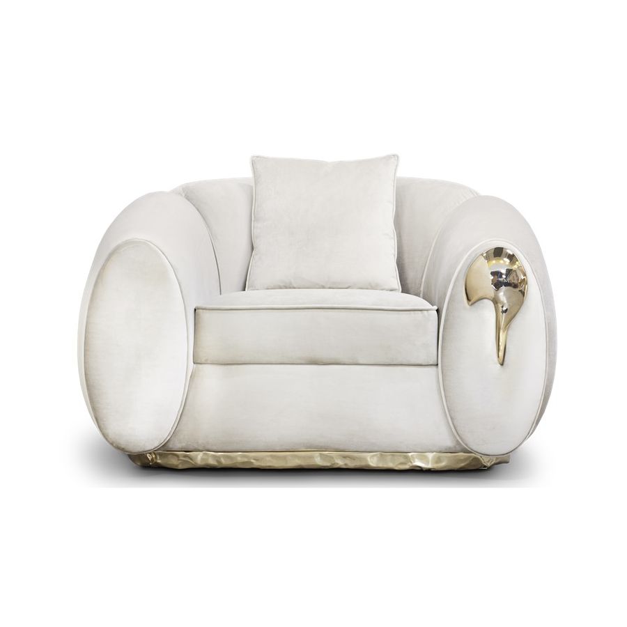 Soleil Armchair is a synthesis of styles and senses. Inspired by the spirit and mission of the famous Cirque de Soleil, the purpose is to invoke, provoke and evoke. Soft, sultry curves gently embrace the sitter in this elegant vintage and contemporary style armchair. Except for the supreme levels of comfort, the brass details on the modern armchair perfectly complement the elegant lines of a timeless piece.