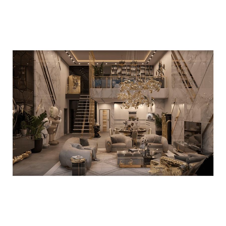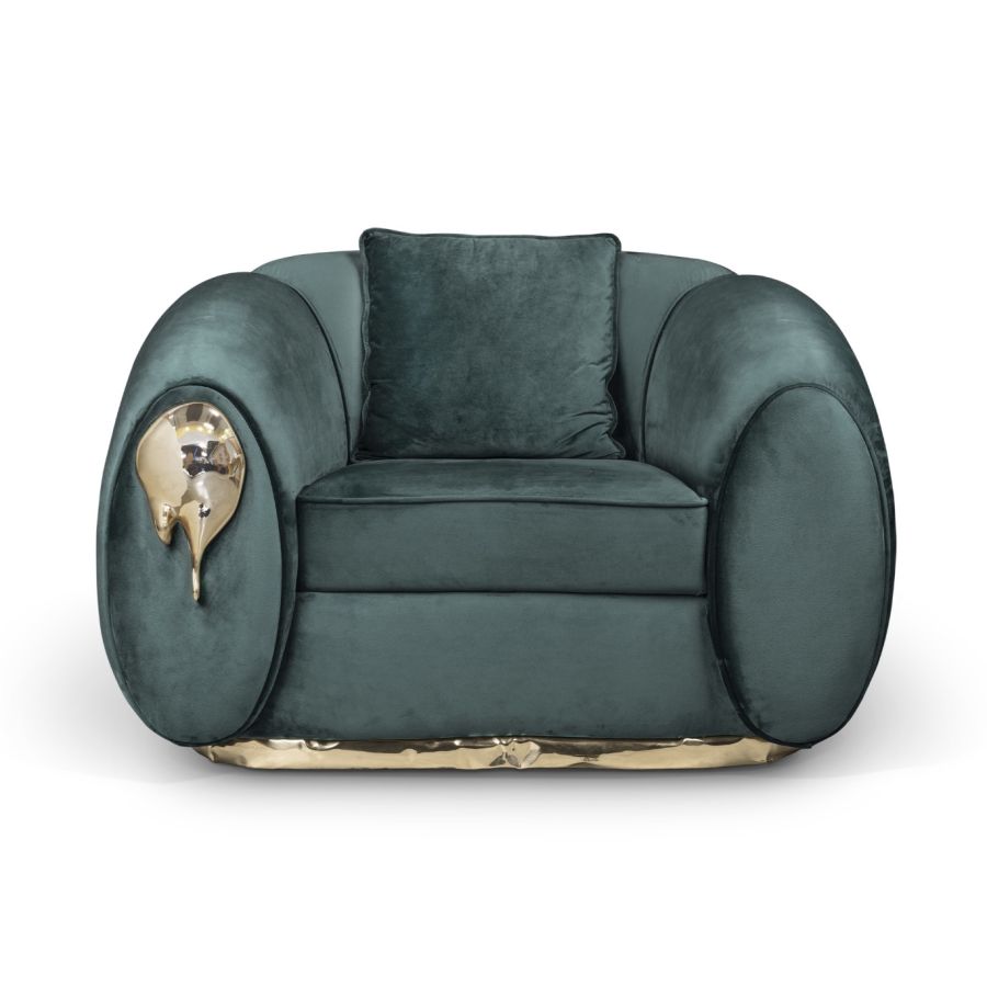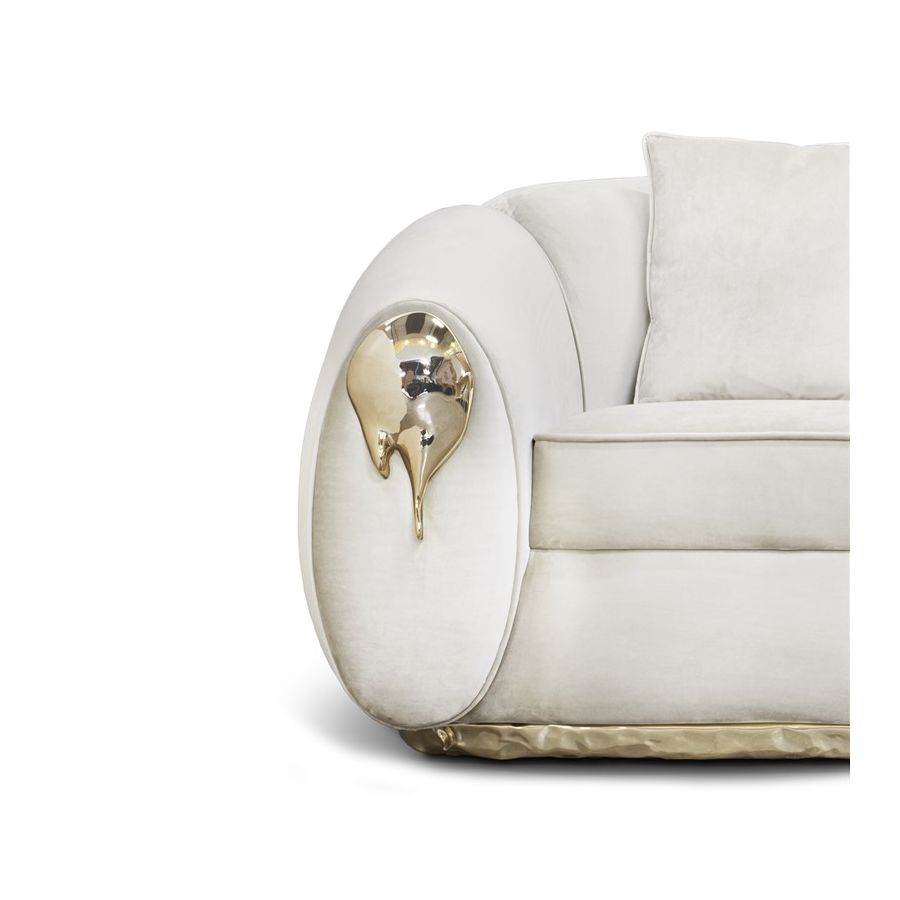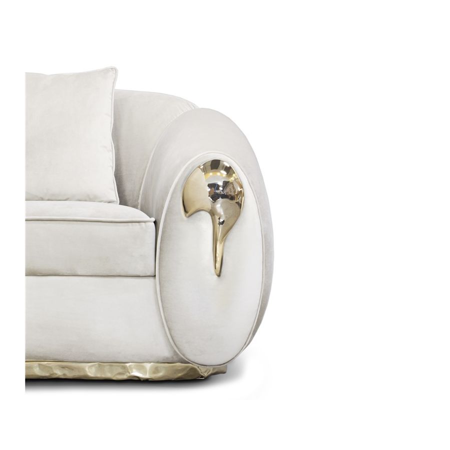 Soleil Armchair is a synthesis of styles and senses. Inspired by the spirit and mission of the famous Cirque de Soleil, the purpose is to invoke, provoke and evoke. Soft, sultry curves gently embrace the sitter in this elegant vintage and contemporary style armchair. Except for the supreme levels of comfort, the brass details on the modern armchair perfectly complement the elegant lines of a timeless piece.