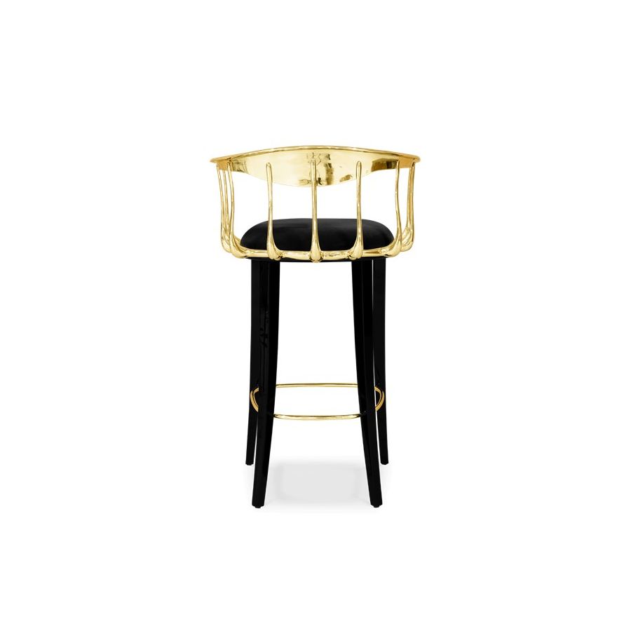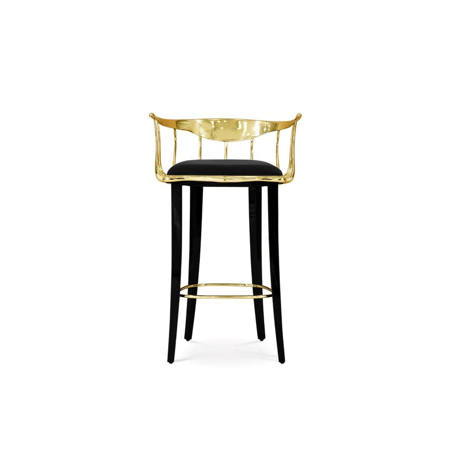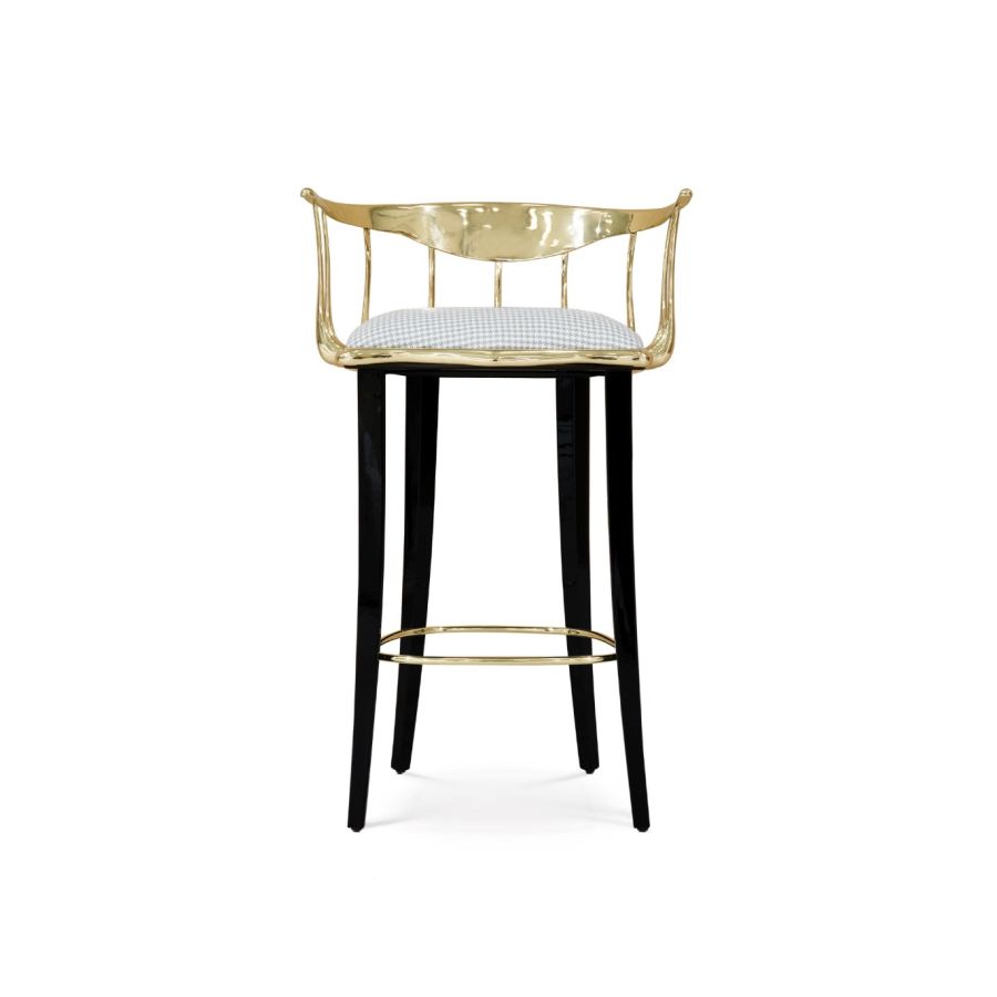 This elegant bar chair features a large bow back rail that’s held by languid spindles that drip solid metal from the apron up, while the legs are lavishly curved creating a visual effect that defies the laws of physics. The seat is available in different fabrics and colours to better suit any upscale lounge area or private bar.