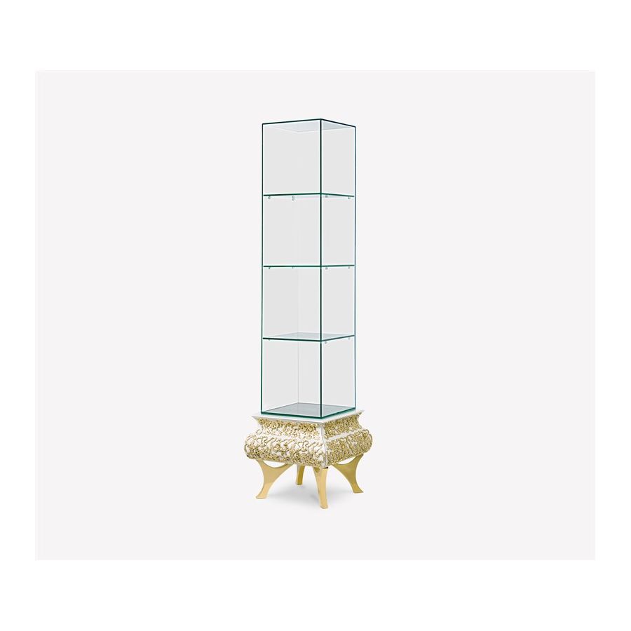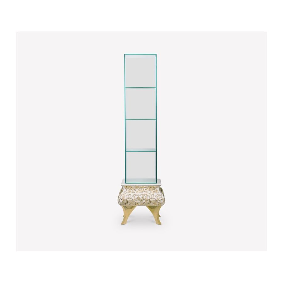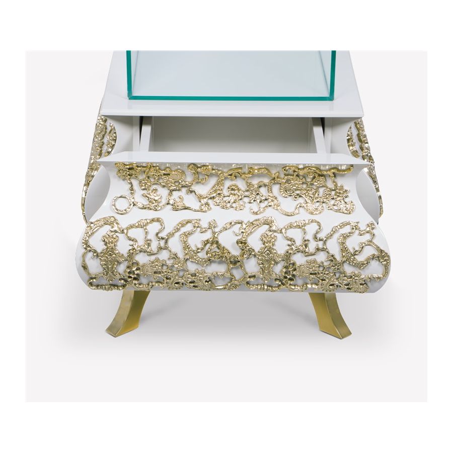 Crochet Perfume Display features the traditional Portuguese knitting technique with the most modern design. Designed with tempered smoked glass, this Perfume Display is perfect for your Luxury Bathroom Decor. This product has three shelves with an open back and the structure is in a white cream lacquered wood lacquered with elegant knitting brass details supported by french-style feet.