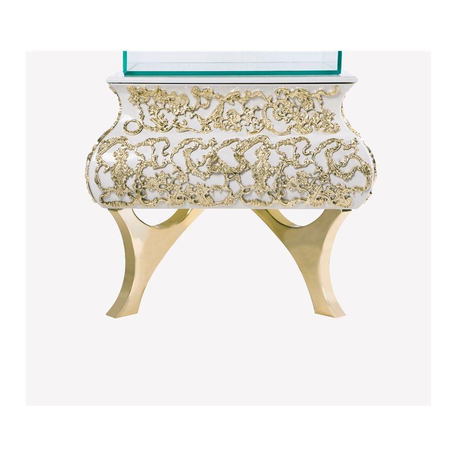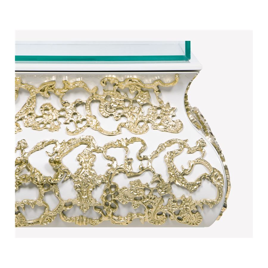 Feet: French-style Polished Brass Structure: Glossy White-Cream Lacquered Wooden, Knitting Polished Brass Details Tempered Smoked Glass with three shelves